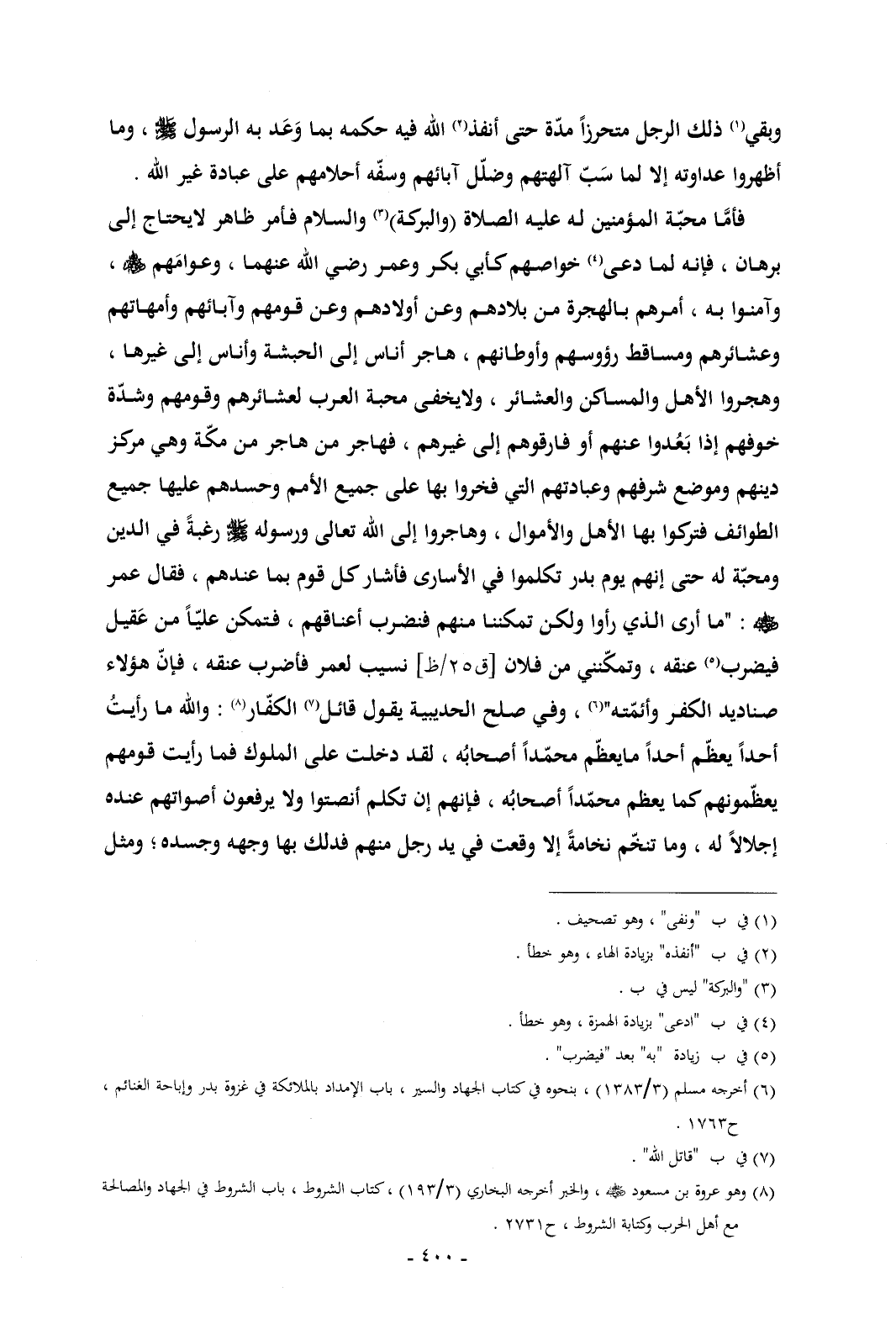 فأمَّا محبّة المؤمنين له عليه الصلاة (والبركة) (¬3) والسلام فأمر ظاهر لايحتاج إلى برهان , فإنه لما دعى (¬4) خواصهم كأبي بكر وعمر رضي الله عنهما , وعوامَهم - رضي الله عنهم - , وآمنوا به , أمرهم بالهجرة من بلادهم وعن أولادهم وعن قومهم وآبائهم وأمهاتهم وعشائرهم ومساقط رؤوسهم وأوطانهم , هاجر أناس إلى الحبشة وأناس إلى غيرها , وهجروا الأهل والمساكن والعشائر , ولايخفى محبة العرب لعشائرهم وقومهم وشدّة خوفهم إذا بَعُدوا عنهم أو فارقوهم إلى غيرهم , فهاجر من هاجر من مكّة وهي مركز دينهم وموضع شرفهم وعبادتهم التي فخروا بها على جميع الأمم وحسدهم عليها جميع الطوائف فتركوا بها الأهل والأموال , وهاجروا إلى الله تعالى ورسوله - صلى الله عليه وسلم - رغبةً في الدين ومحبّة له حتى إنهم يوم بدر تكلموا في الأسارى فأشار كل قوم بما عندهم , فقال عمر - رضي الله عنه -: "ما أرى الذي رأوا ولكن تمكننا منهم فنضرب أعناقهم , فتمكن عليّاً من عَقيل فيضرب (¬5) عنقه , وتمكّنني من فلان [ق 25/ظ] نسيب لعمر فأضرب عنقه , فإنّ هؤلاء صناديد الكفر وأئمّته" (¬6) , وفي صلح الحديبية يقول قائل (¬7) الكفّار (¬8): والله ما رأيتُ أحداً يعظّم أحداً مايعظّم محمّداً أصحابُه , لقد دخلت على الملوك فما رأيت قومهم يعظّمونهم كما يعظم محمّداً أصحابُه , فإنهم إن تكلم أنصتوا ولا يرفعون أصواتهم عنده