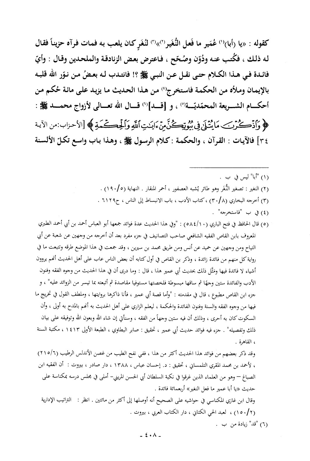 كقوله: «يا (أبا) (¬1) عُمَير ما فَعل النُّغَير (¬2)» (¬3) لنُغَرٍ كان يلعب به فمات فرآه حزيناً فقال له ذلك , فكُتب عنه ودُوّن وصُحّح , فاعترض بعض الزنادقة والملحدين وقال: وأيّ فائدة في هذا الكلام حتى نقل عن النبي - صلى الله عليه وسلم -؟ ! فانتدب له بعضُ من نوّر الله قلبه بالإيمان وملأه من الحكمة فاستخرج (¬4) من هذا الحديث ما يزيد على مائة حُكم من أحكام الشريعة المحمّديّة (¬5) , و [قد] (¬6) قال الله تعالى لأزواج محمد - صلى الله عليه وسلم -: {وَاذْكُرْنَ مَا يُتْلَى فِي بُيُوتِكُنَّ مِنْ آيَاتِ اللَّهِ وَالْحِكْمَةِ} [الأحزاب: من الآية 34] فالآيات: القرآن , والحكمة: كلام الرسول - صلى الله عليه وسلم - , وهذا باب واسع تكلّ الألسنة