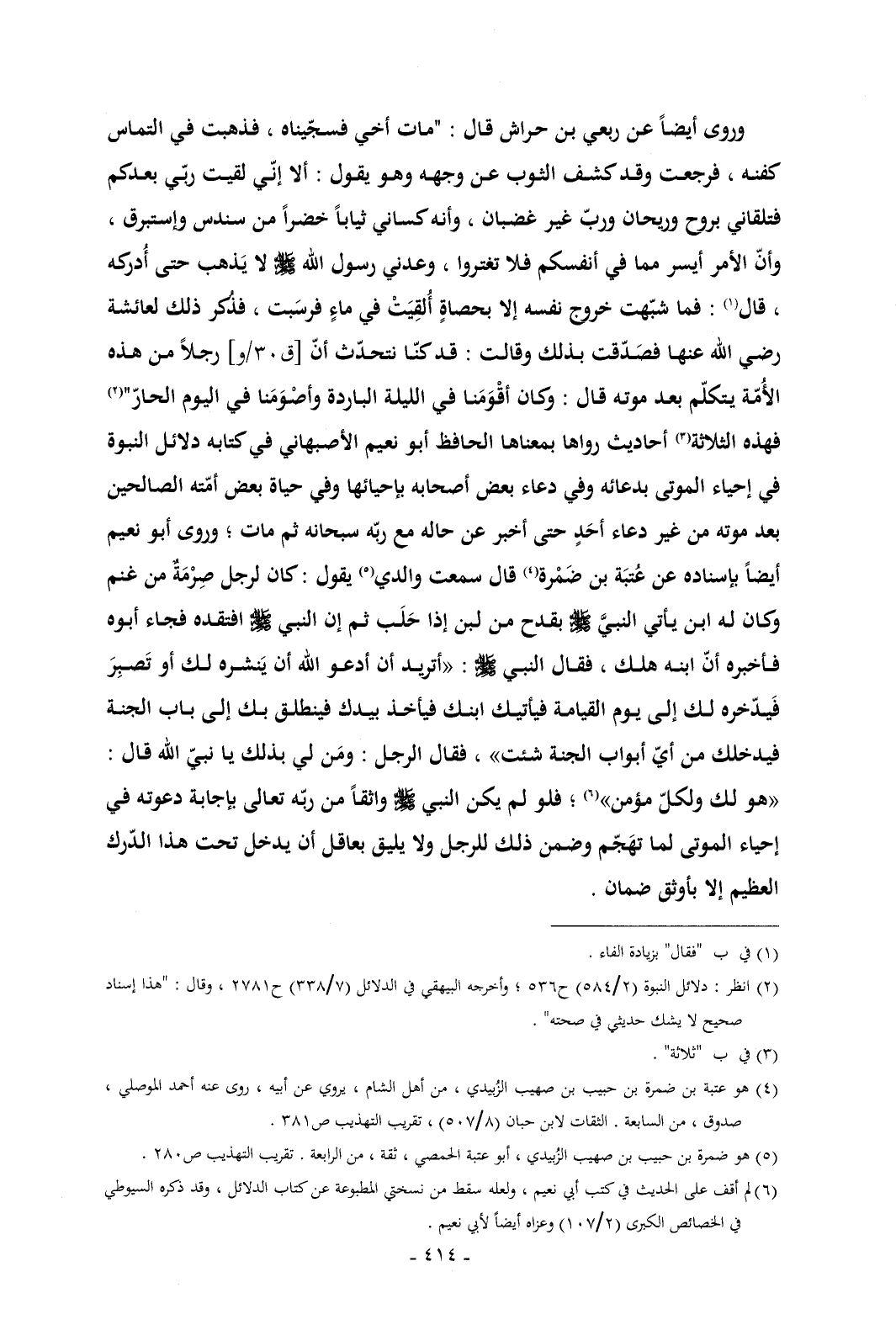 وروى أيضاً عن ربعي بن حراش قال: "مات أخي فسجّيناه , فذهبت في التماس كفنه , فرجعت وقد كشف الثوب عن وجهه وهو يقول: ألا إنّي لقيت ربّي بعدكم فتلقاني بروح وريحان وربّ غير غضبان , وأنه كساني ثياباً خضراً من سندس وإستبرق , وأنّ الأمر أيسر مما في أنفسكم فلا تغتروا , وعدني رسول الله - صلى الله عليه وسلم - لا يَذهب حتى أُدركه , قال (¬1): فما شبّهت خروج نفسه إلا بحصاةٍ أُلقِيَتْ في ماءٍ فرسَبت , فذُكر ذلك لعائشة رضي الله عنها فصَدّقت بذلك وقالت: قد كنّا نتحدّث أنّ [ق 30/و] رجلاً من هذه الأُمّة يتكلّم بعد موته قال: وكان أقْوَمَنا في الليلة الباردة وأصْوَمَنا في اليوم الحارّ" (¬2) فهذه الثلاثة (¬3) أحاديث رواها بمعناها الحافظ أبو نعيم الأصبهاني في كتابه دلائل النبوة في إحياء الموتى بدعائه وفي دعاء بعض أصحابه بإحيائها وفي حياة بعض أمّته الصالحين بعد موته من غير دعاء أحَدٍ حتى أخبر عن حاله مع ربّه سبحانه ثم مات؛ وروى أبو نعيم أيضاً بإسناده عن عُتبَة بن ضَمْرة (¬4) قال سمعت والدي (¬5) يقول: كان لرجل صِرْمَةٌ من غنم وكان له ابن يأتي النبيَّ - صلى الله عليه وسلم - بقدح من لبن إذا حَلَب ثم إن النبي - صلى الله عليه وسلم - افتقده فجاء أبوه فأخبره أنّ ابنه هلك , فقال النبي - صلى الله عليه وسلم -: «أتريد أن أدعو الله أن يَنشره لك أو تَصبِرَ فَيدّخره لك إلى يوم القيامة فيأتيك ابنك فيأخذ بيدك فينطلق بك إلى باب الجنة فيدخلك من أيّ أبواب الجنة شئت» , فقال الرجل: ومَن لي بذلك يا نبيّ الله قال: «هو لك ولكلّ مؤمن» (¬6)؛ فلو لم يكن النبي - صلى الله عليه وسلم - واثقاً من ربّه تعالى بإجابة دعوته في إحياء الموتى لما تهَجّم وضمن ذلك للرجل ولا يليق بعاقل أن يدخل تحت هذا الدّرك العظيم إلا بأوثق ضمان.