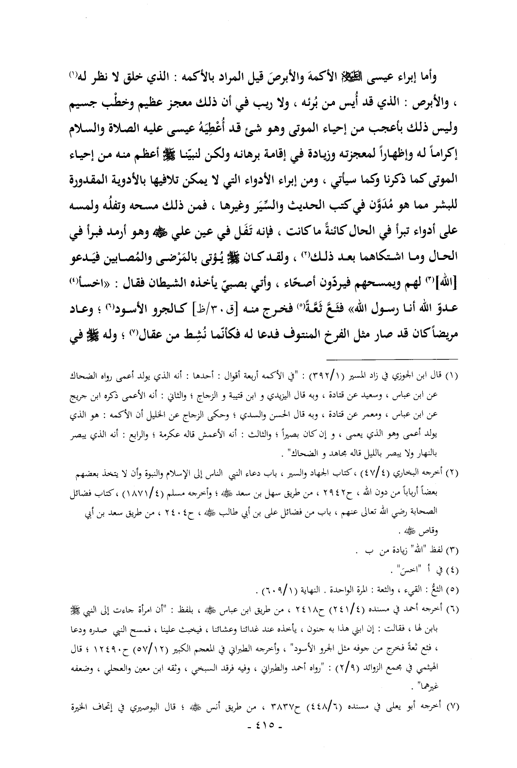 وأما إبراء عيسى - عليه السلام - الأكمهَ والأبرصَ قيل المراد بالأكمه: الذي خلق لا نظر له (¬1) , والأبرص: الذي قد أُيس من بُرئه , ولا ريب في أن ذلك معجز عظيم وخطْب جسيم وليس ذلك بأعجب من إحياء الموتى وهو شئ قد أُعْطِيَهُ عيسى عليه الصلاة والسلام إكراماً له وإظهاراً لمعجزته وزيادة في إقامة برهانه ولكن لنبيّنا - صلى الله عليه وسلم - أعظم منه من إحياء الموتى كما ذكرنا وكما سيأتي , ومن إبراء الأدواء التي لا يمكن تلافيها بالأدوية المقدورة للبشر مما هو مُدَوَّن في كتب الحديث والسِّيَر وغيرها , فمن ذلك مسحه وتفلُه ولمسه على أدواء تبرأ في الحال كائنةً ما كانت , فإنه تَفَل في عين علي - رضي الله عنه - وهو أرمد فبرأ في الحال وما اشتكاهما بعد ذلك (¬2) , ولقد كان - صلى الله عليه وسلم - يُؤتى بالمَرْضى والمُصابين فيَدعو [الله] (¬3) لهم ويمسحهم فيردّون أصحّاء , وأتي بصبيّ يأخذه الشيطان فقال: «اخسأ (¬4) عدوّ الله أنا رسول الله» فثَعَّ ثَعَّةً (¬5) فخرج منه [ق 30/ظ] كالجرو الأسود (¬6)؛ وعاد مريضاً كان قد صار مثل الفرخ المنتوف فدعا له فكأنّما نُشِط من عقال (¬7)؛ وله - صلى الله عليه وسلم - في