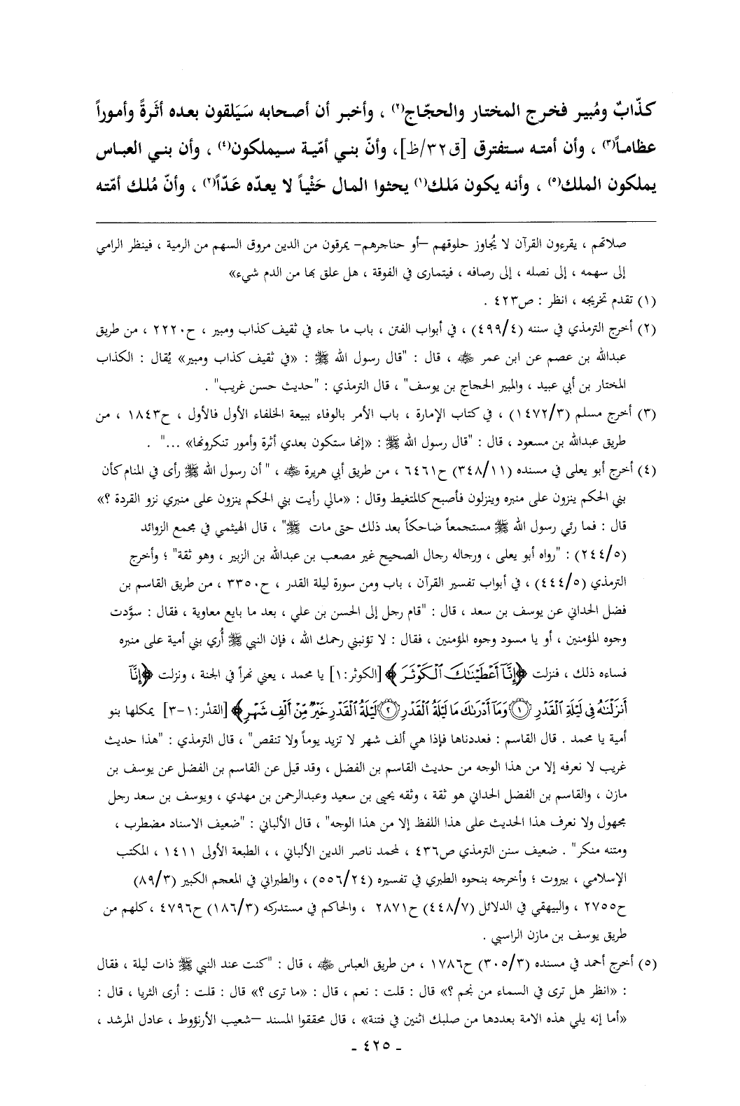 (¬4) أخرج أحمد في مسنده (3/ 305) ح 1786 , من طريق العباس - رضي الله عنه - , قال: "كنت عند النبي - صلى الله عليه وسلم - ذات ليلة , فقال: «انظر هل ترى في السماء من نجم؟ » قال: قلت: نعم , قال: «ما ترى؟ » قال: قلت: أرى الثريا , قال: «أما إنه يلي هذه الامة بعددها من صلبك اثنين في فتنة» , قال محققوا المسند -شعيب الأرنؤوط , عادل المرشد , وآخرون , بإشراف: د. عبدالله التركي-: "إسناده ضعيف جداً" , وأخرجه الحاكم في مستدركه (3/ 368) ح 5414 , وقال: "هذا حديث تفرد به عبيد بن أبي قرة عن الليث , وإمامنا أبو زكريا رحمه الله لو لم يرضه لما حدث عنه بمثل هذا الحديث" , وأخرجه الضياء المقدسي في الأحاديث المختارة (3/ 364) , تحقيق: عبدالملك بن دهيش , الطبعة الأولى 1410 , مكتبة النهضة , مكة , وقال في إسناده: "لا بأس به"؛ وأخرج البزار في مسنده (16/ 60) ح 9103 , من طريق أبي هريرة - رضي الله عنه - , قال: "قال رسول الله - صلى الله عليه وسلم - للعباس: «فيكم النبوة والمملكة» , قال البزار في سنده: "محمد بن عبدالرحمن ضعيف لم يرو إلا هذا الحديث" , وأخرجه البيهقي في الدلائل (7/ 463) ح 2885 , وقال: "تفرد به محمد بن عبدالرحمن العامري عن سهيل , وليس بالقوي".