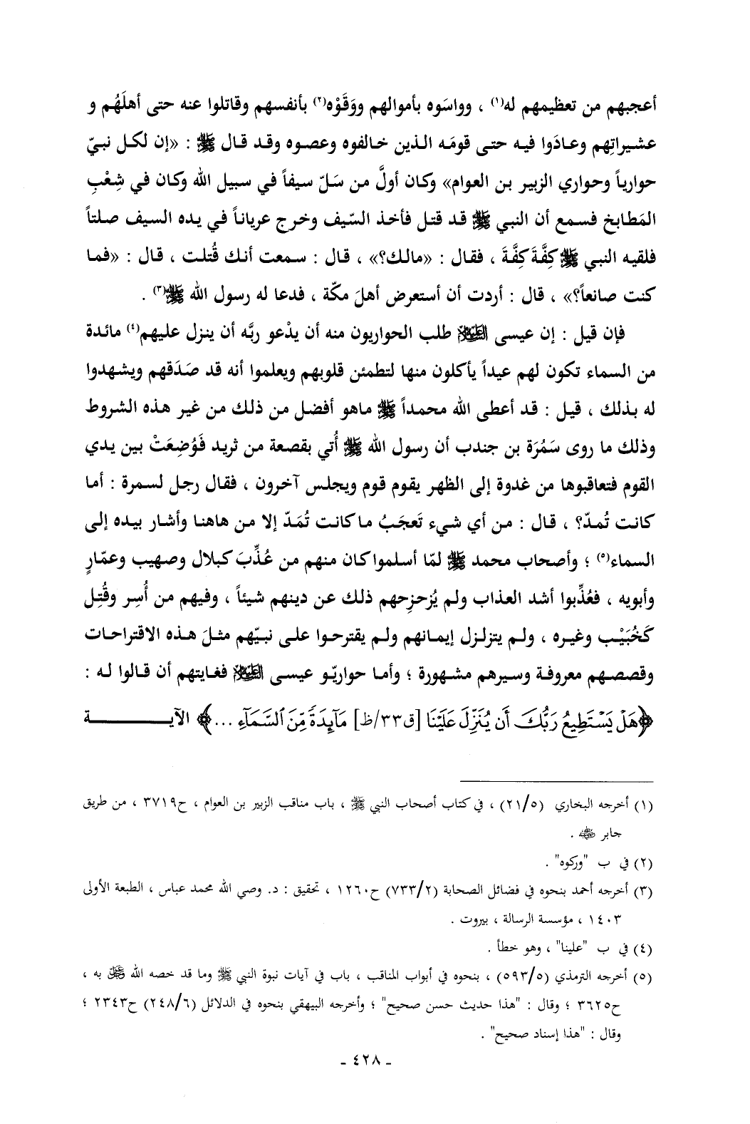 فإن قيل: إن عيسى - عليه السلام - طلب الحواريون منه أن يدْعو ربَّه أن ينزل عليهم (¬4) مائدة من السماء تكون لهم عيداً يأكلون منها لتطمئن قلوبهم ويعلموا أنه قد صَدَقهم ويشهدوا له بذلك، قيل: قد أعطى الله محمداً - صلى الله عليه وسلم - ماهو أفضل من ذلك من غير هذه الشروط وذلك ما روى سَمُرَة بن جندب أن رسول الله - صلى الله عليه وسلم - أُتي بقصعة من ثريد فَوُضِعَتْ بين يدي القوم فتعاقبوها من غدوة إلى الظهر يقوم قوم ويجلس آخرون , فقال رجل لسمرة: أما كانت تُمدّ؟ , قال: من أي شيء تَعجَبُ ما كانت تُمَدّ إلا من هاهنا وأشار بيده إلى السماء (¬5)؛ وأصحاب محمد - صلى الله عليه وسلم - لمّا أسلموا كان منهم من عُذِّبَ كبلال وصهيب وعمّارٍ وأبويه , فعُذِّبوا أشد العذاب ولم يُزحزِحهم ذلك عن دينهم شيئاً , وفيهم من أُسِر وقُتِل كَخُبَيْب وغيره , ولم يتزلزل إيمانهم ولم يقترحوا على نبيّهم مثلَ هذه الاقتراحات وقصصهم معروفة وسيرهم مشهورة؛ وأما حواريّو عيسى - عليه السلام - فغايتهم أن قالوا له: {هَلْ يَسْتَطِيعُ رَبُّكَ أَنْ يُنَزِّلَ عَلَيْنَا [ق 33/ظ] مَائِدَةً مِنَ السَّمَاءِ ... } الآية