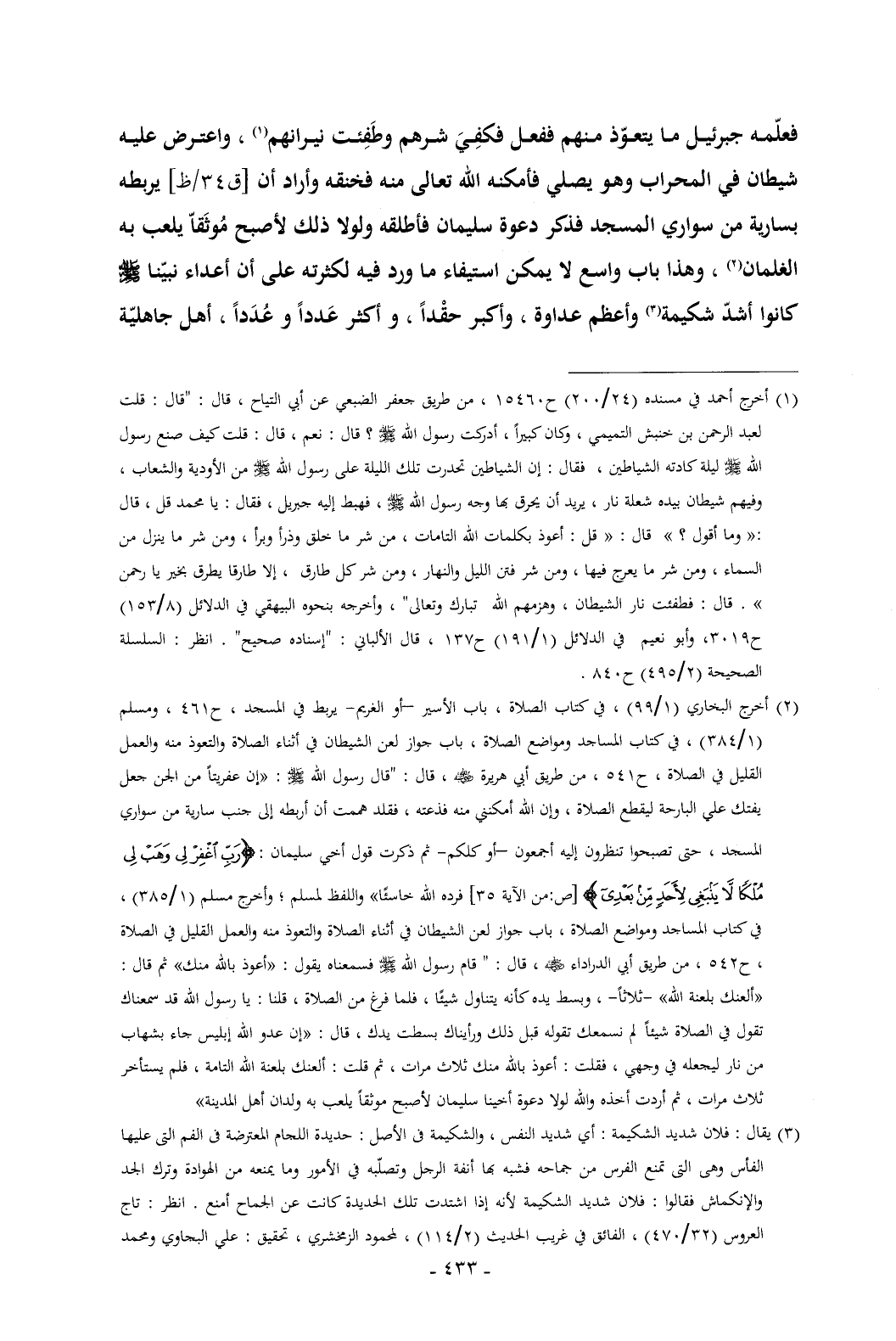 (¬2) أخرج البخاري (1/ 99) , في كتاب الصلاة , باب الأسير -أو الغريم- يربط في المسجد , ح 461 , ومسلم (1/ 384) , في كتاب المساجد ومواضع الصلاة , باب جواز لعن الشيطان في أثناء الصلاة والتعوذ منه والعمل القليل في الصلاة , ح 541 , من طريق أبي هريرة - رضي الله عنه - , قال: "قال رسول الله - صلى الله عليه وسلم -: «إن عفريتاً من الجن جعل يفتك علي البارحة ليقطع الصلاة , وإن الله أمكنني منه فذعته , فقلد هممت أن أربطه إلى جنب سارية من سواري المسجد , حتى تصبحوا تنظرون إليه أجمعون -أو كلكم- ثم ذكرت قول أخي سليمان: {رَبِّ اغْفِرْ لِي وَهَبْ لِي مُلْكًا لَا يَنْبَغِي لِأَحَدٍ مِنْ بَعْدِي} [ص: من الآية 35] فرده الله خاسئًا» واللفظ لمسلم؛ وأخرج مسلم (1/ 385) , في كتاب المساجد ومواضع الصلاة , باب جواز لعن الشيطان في أثناء الصلاة والتعوذ منه والعمل القليل في الصلاة , ح 542 , من طريق أبي الدراداء - رضي الله عنه - , قال: " قام رسول الله - صلى الله عليه وسلم - فسمعناه يقول: «أعوذ بالله منك» ثم قال: «ألعنك بلعنة الله» -ثلاثاً- , وبسط يده كأنه يتناول شيئًا , فلما فرغ من الصلاة , قلنا: يا رسول الله قد سمعناك تقول في الصلاة شيئاً لم نسمعك تقوله قبل ذلك ورأيناك بسطت يدك , قال: «إن عدو الله إبليس جاء بشهاب من نار ليجعله في وجهي , فقلت: أعوذ بالله منك ثلاث مرات , ثم قلت: ألعنك بلعنة الله التامة , فلم يستأخر ثلاث مرات , ثم أردت أخذه والله لولا دعوة أخينا سليمان لأصبح موثقاً يلعب به ولدان أهل المدينة»