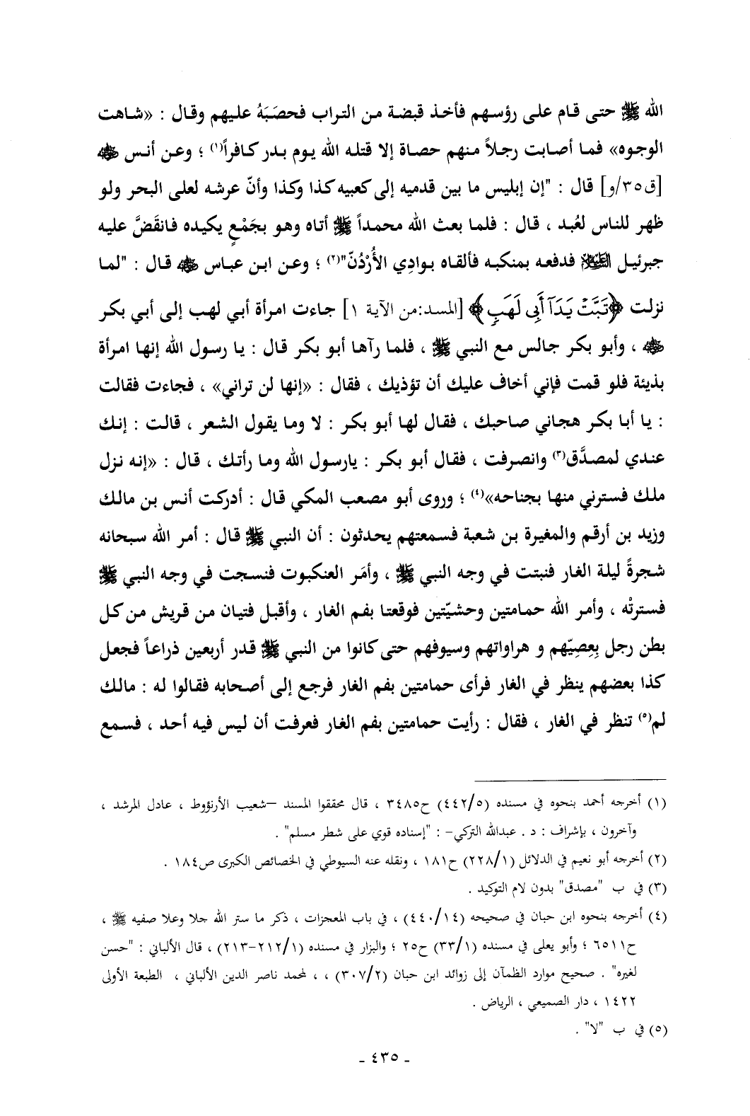 الله - صلى الله عليه وسلم - حتى قام على رؤسهم فأخذ قبضة من التراب فحصَبَهُ عليهم وقال: «شاهت الوجوه» فما أصابت رجلاً منهم حصاة إلا قتله الله يوم بدر كافراً (¬1)؛ وعن أنس - رضي الله عنه -[ق 35/و] قال: "إن إبليس ما بين قدميه إلى كعبيه كذا وكذا وأنّ عرشه لعلى البحر ولو ظهر للناس لعُبد , قال: فلما بعث الله محمداً - صلى الله عليه وسلم - أتاه وهو بجَمْعٍ يكيده فانقَضَّ عليه جبرئيل - عليه السلام - فدفعه بمنكبه فألقاه بوادِي الأُرْدُنّ" (¬2)؛ وعن ابن عباس - رضي الله عنه - قال: "لما نزلت {تَبَّتْ يَدَا أَبِي لَهَبٍ} [المسد: من الآية 1] جاءت امرأة أبي لهب إلى أبي بكر - رضي الله عنه - , وأبو بكر جالس مع النبي - صلى الله عليه وسلم - , فلما رآها أبو بكر قال: يا رسول الله إنها امرأة بذيئة فلو قمت فإني أخاف عليك أن تؤذيك , فقال: «إنها لن تراني» , فجاءت فقالت: يا أبا بكر هجاني صاحبك , فقال لها أبو بكر: لا وما يقول الشعر , قالت: إنك عندي لمصدَّق (¬3) وانصرفت , فقال أبو بكر: يارسول الله وما رأتك , قال: «إنه نزل ملك فسترني منها بجناحه» (¬4)؛ وروى أبو مصعب المكي قال: أدركت أنس بن مالك وزيد بن أرقم والمغيرة بن شعبة فسمعتهم يحدثون: أن النبي - صلى الله عليه وسلم - قال: أمر الله سبحانه شجرةً ليلة الغار فنبتت في وجه النبي - صلى الله عليه وسلم - , وأمَر العنكبوت فنسجت في وجه النبي - صلى الله عليه وسلم - فسترتْه , وأمر الله حمامتين وحشيّتين فوقعتا بفم الغار , وأقبل فتيان من قريش من كل بطن رجل بِعِصِيّهم وهراواتهم وسيوفهم حتى كانوا من النبي - صلى الله عليه وسلم - قدر أربعين ذراعاً فجعل كذا بعضهم ينظر في الغار فرأى حمامتين بفم الغار فرجع إلى أصحابه فقالوا له: مالك