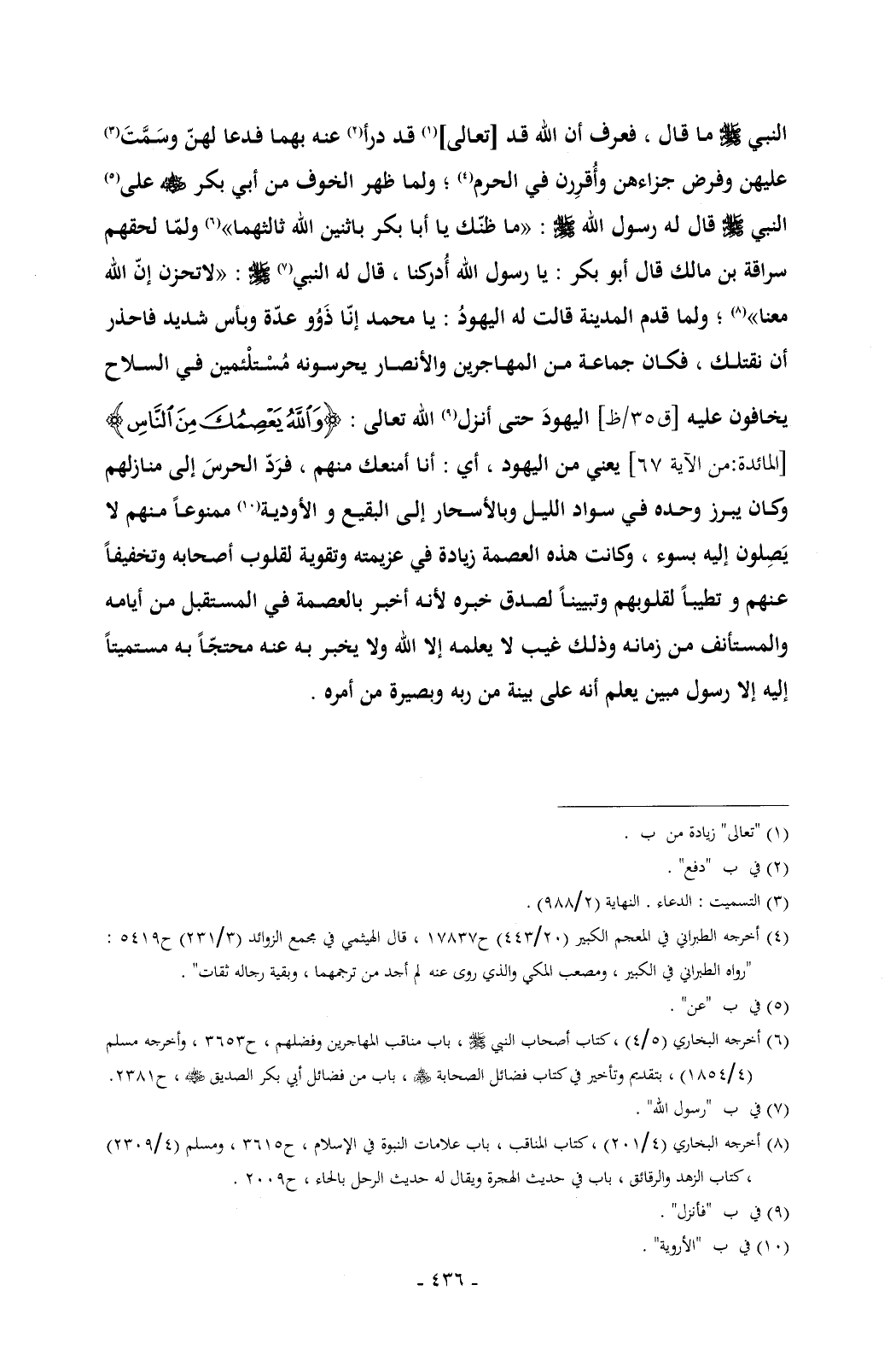 النبي - صلى الله عليه وسلم - ما قال , فعرف أن الله قد [تعالى] (¬1) قد درأ (¬2) عنه بهما فدعا لهنّ وسَمَّتَ (¬3) عليهن وفرض جزاءهن وأُقرِرن في الحرم (¬4)؛ ولما ظهر الخوف من أبي بكر - رضي الله عنه - على (¬5) النبي - صلى الله عليه وسلم - قال له رسول الله - صلى الله عليه وسلم -: «ما ظنّك يا أبا بكر باثنين الله ثالثهما» (¬6) ولمّا لحقهم سراقة بن مالك قال أبو بكر: يا رسول الله أُدركنا , قال له النبي (¬7) - صلى الله عليه وسلم -: «لاتحزن إنّ الله معنا» (¬8)؛ ولما قدم المدينة قالت له اليهودُ: يا محمد إنّا ذَوُو عدّة وبأس شديد فاحذر أن نقتلك , فكان جماعة من المهاجرين والأنصار يحرسونه مُسْتلْئمين في السلاح يخافون عليه [ق 35/ظ] اليهودَ حتى أنزل (¬9) الله تعالى: {وَاللَّهُ يَعْصِمُكَ مِنَ النَّاسِ} [المائدة: من الآية 67] يعني من اليهود , أي: أنا أمنعك منهم , فرَدّ الحرسَ إلى منازلهم وكان يبرز وحده في سواد الليل وبالأسحار إلى البقيع والأودية (¬10) ممنوعاً منهم لا يَصِلون إليه بسوء , وكانت هذه العصمة زيادة في عزيمته وتقوية لقلوب أصحابه وتخفيفاً عنهم وتطيباً لقلوبهم وتبييناً لصدق خبره لأنه أخبر بالعصمة في المستقبل من أيامه