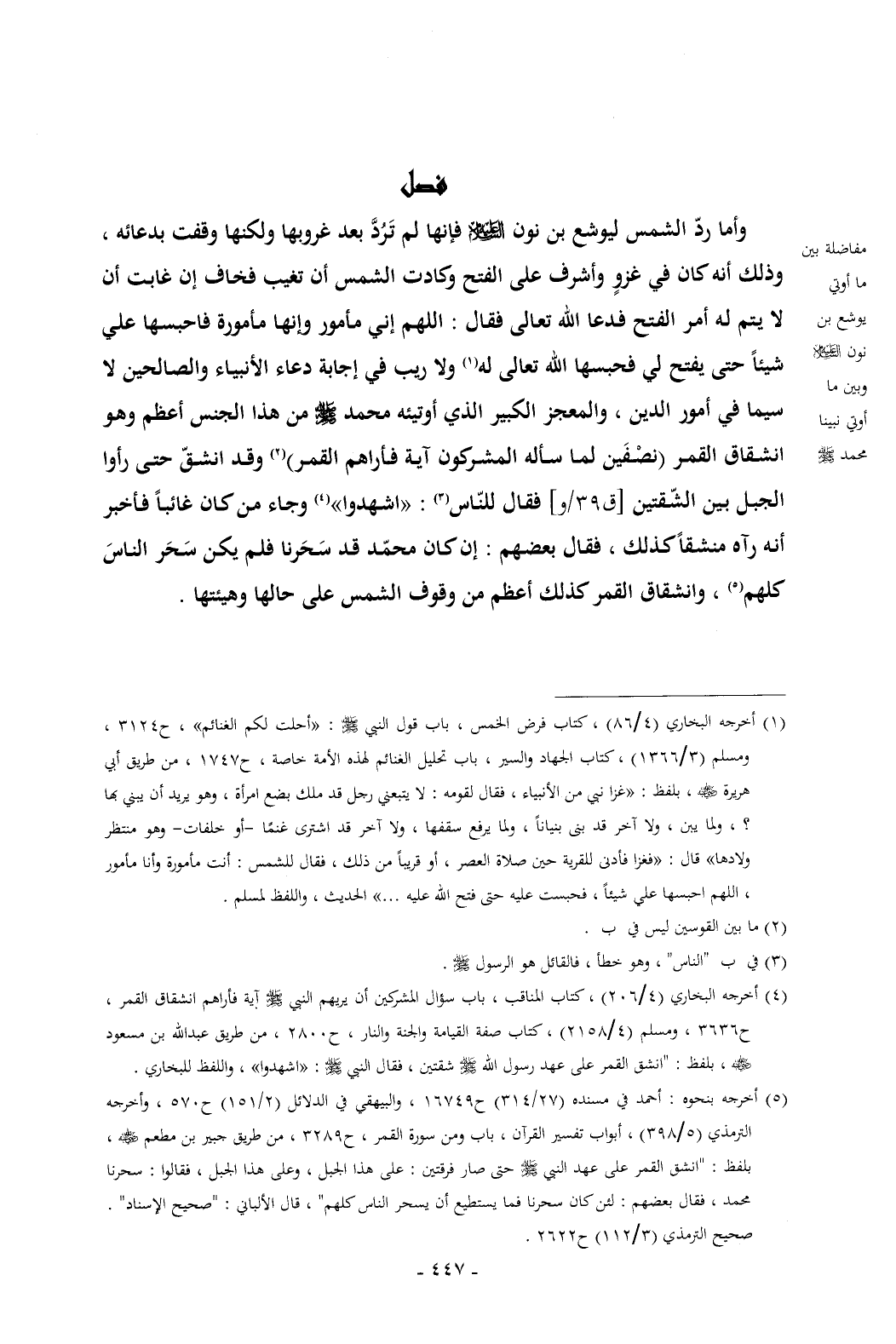 وأما ردّ الشمس ليوشع بن نون - عليه السلام - فإنها لم تَرُدَّ بعد غروبها ولكنها وقفت بدعائه , وذلك أنه كان في غزوٍ وأشرف على الفتح وكادت الشمس أن تغيب فخاف إن غابت أن لا يتم له أمر الفتح فدعا الله تعالى فقال: اللهم إني مأمور وإنها مأمورة فاحبسها علي شيئاً حتى يفتح لي فحبسها الله تعالى له (¬1) ولا ريب في إجابة دعاء الأنبياء والصالحين لا سيما في أمور الدين , والمعجز الكبير الذي أوتيئه محمد - صلى الله عليه وسلم - من هذا الجنس أعظم وهو انشقاق القمر (نصْفَين لما سأله المشركون آية فأراهم القمر) (¬2) وقد انشقّ حتى رأوا الجبل بين الشّقتين [ق 39/و] فقال للنّاس (¬3): «اشهدوا» (¬4) وجاء من كان غائباً فأخبر