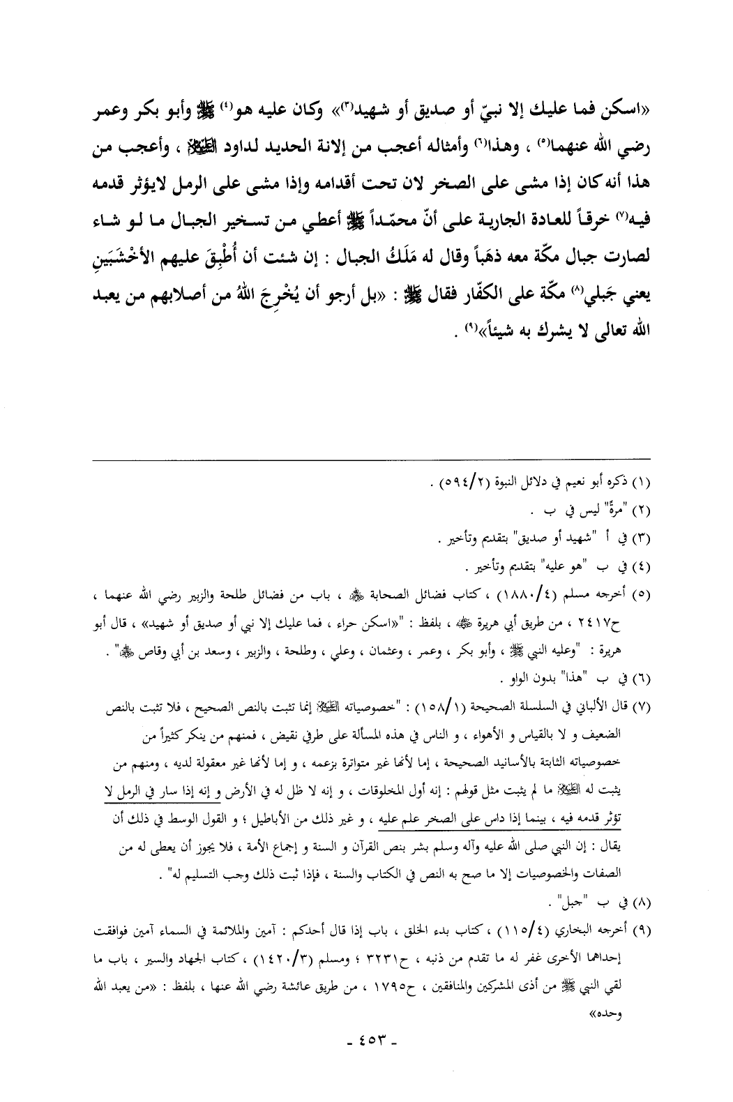 «اسكن فما عليك إلا نبيّ أو صديق أو شهيد (¬1)» وكان عليه هو (¬2) - صلى الله عليه وسلم - وأبو بكر وعمر رضي الله عنهما (¬3) , وهذا (¬4) وأمثاله أعجب من إلانة الحديد لداود - عليه السلام - , وأعجب من هذا أنه كان إذا مشى على الصخر لان تحت أقدامه وإذا مشى على الرمل لايؤثر قدمه فيه (¬5) خرقاً للعادة الجارية على أنّ محمّداً - صلى الله عليه وسلم - أعطي من تسخير الجبال ما لو شاء