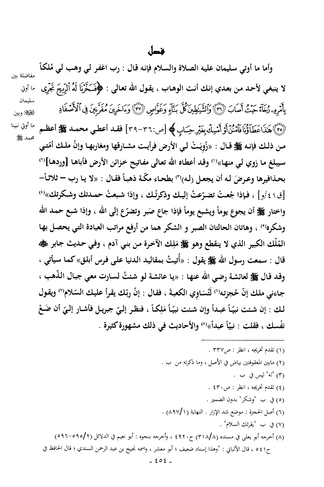 وأما ما أوتي سليمان عليه الصلاة والسلام فإنه قال: رب اغفر لي وهب لي مُلكاً لا ينبغي لأحد من بعدي إنك أنت الوهاب , يقول الله تعالى: {فَسَخَّرْنَا لَهُ الرِّيحَ تَجْرِي بِأَمْرِهِ رُخَاءً حَيْثُ أَصَابَ (36) وَالشَّيَاطِينَ كُلَّ بَنَّاءٍ وَغَوَّاصٍ (37) وَآخَرِينَ مُقَرَّنِينَ فِي الْأَصْفَادِ (38) هَذَا عَطَاؤُنَا فَامْنُنْ أَوْ أَمْسِكْ بِغَيْرِ حِسَابٍ} [ص: 36 - 39] فقد أعطي محمد - صلى الله عليه وسلم - أعظم من ذلك فإنه - صلى الله عليه وسلم - قال: «زُوِيَتْ لي الأرض فرأيت مشارقها ومغاربها وإنّ ملك أمّتي سيبلغ ما زوي لي منها» (¬1) وقد أعطاه الله تعالى مفاتيح خزائن الأرض فأباها [وردها] (¬2) بحذافيرها وعرضَ له أن يجعل (له) (¬3) بطحاء مكّة ذهباً فقال: «لا يا رب - ثلاثاً-[ق 41/و] , فإذا جُعتُ تضرّعتُ إليك وذكرتُك , وإذا شبعتُ حمدتك وشكرتك» (¬4) واختار - صلى الله عليه وسلم - أن يجوع يوماً ويشبع يوماً فإذا جاع صَبر وتضرّع إلى الله , وإذا شبع حمد الله