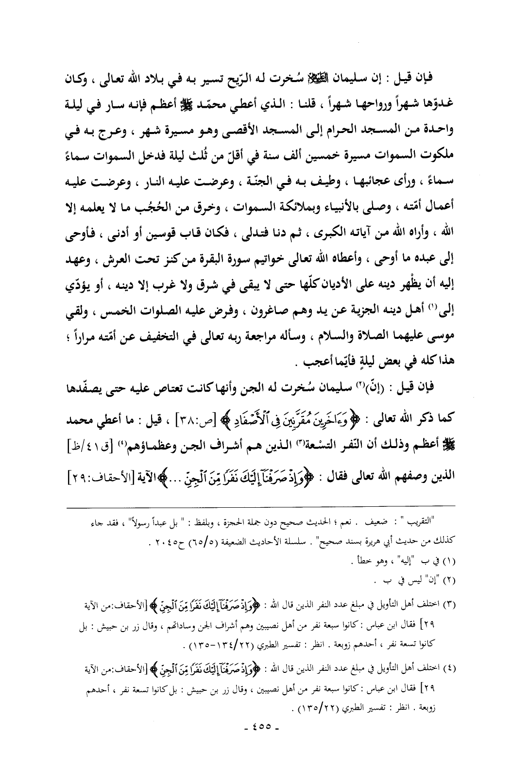 فإن قيل: (إنّ) (¬2) سليمان سُخرت له الجن وأنها كانت تعتاص عليه حتى يصفّدها كما ذكر الله تعالى: {وَآخَرِينَ مُقَرَّنِينَ فِي الْأَصْفَادِ} [ص: 38] , قيل: ما أعطي محمد - صلى الله عليه وسلم - أعظم وذلك أن النّفر التسْعة (¬3) الذين هم أشراف الجن وعظماؤهم (¬4) [ق 41/ظ] الذين وصفهم الله تعالى فقال: {وَإِذْ صَرَفْنَا إِلَيْكَ نَفَرًا مِنَ الْجِنِّ ... } الآية [الأحقاف: 29]