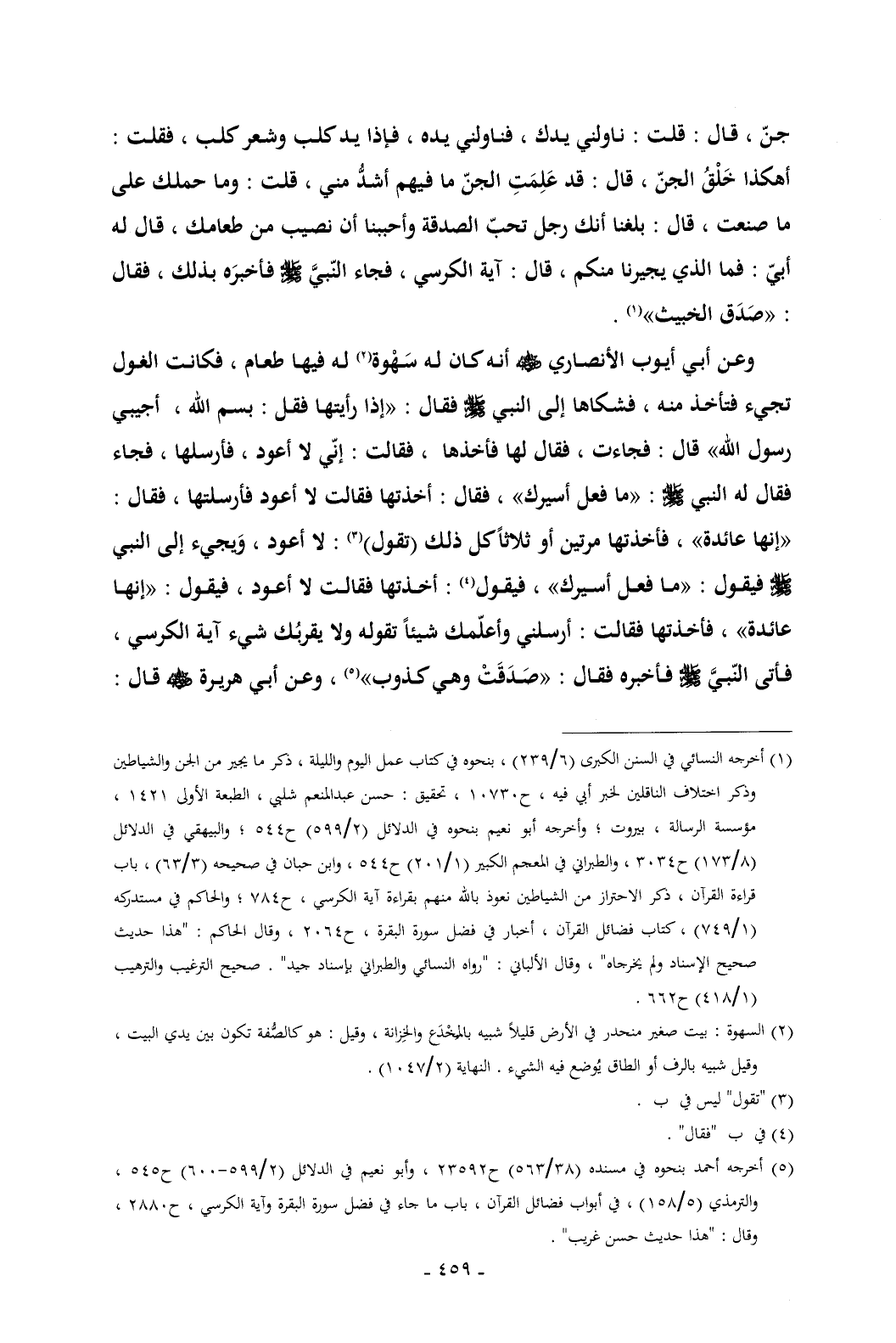 (¬1) أخرجه النسائي في السنن الكبرى (6/ 239) , بنحوه في كتاب عمل اليوم والليلة , ذكر ما يجير من الجن والشياطين وذكر اختلاف الناقلين لخبر أبي فيه , ح 10730 , تحقيق: حسن عبدالمنعم شلبي , الطبعة الأولى 1421 , مؤسسة الرسالة , بيروت؛ وأخرجه أبو نعيم بنحوه في الدلائل (2/ 599) ح 544؛ والبيهقي في الدلائل (8/ 173) ح 3034 , والطبراني في المعجم الكبير (1/ 201) ح 544 , وابن حبان في صحيحه (3/ 63) , باب قراءة القرآن , ذكر الاحتراز من الشياطين نعوذ بالله منهم بقراءة آية الكرسي , ح 784؛ والحاكم في مستدركه (1/ 749) , كتاب فضائل القرآن , أخبار في فضل سورة البقرة , ح 2064 , وقال الحاكم: "هذا حديث صحيح الإسناد ولم يخرجاه" , وقال الألباني: "رواه النسائي والطبراني بإسناد جيد". صحيح الترغيب والترهيب (1/ 418) ح 662.