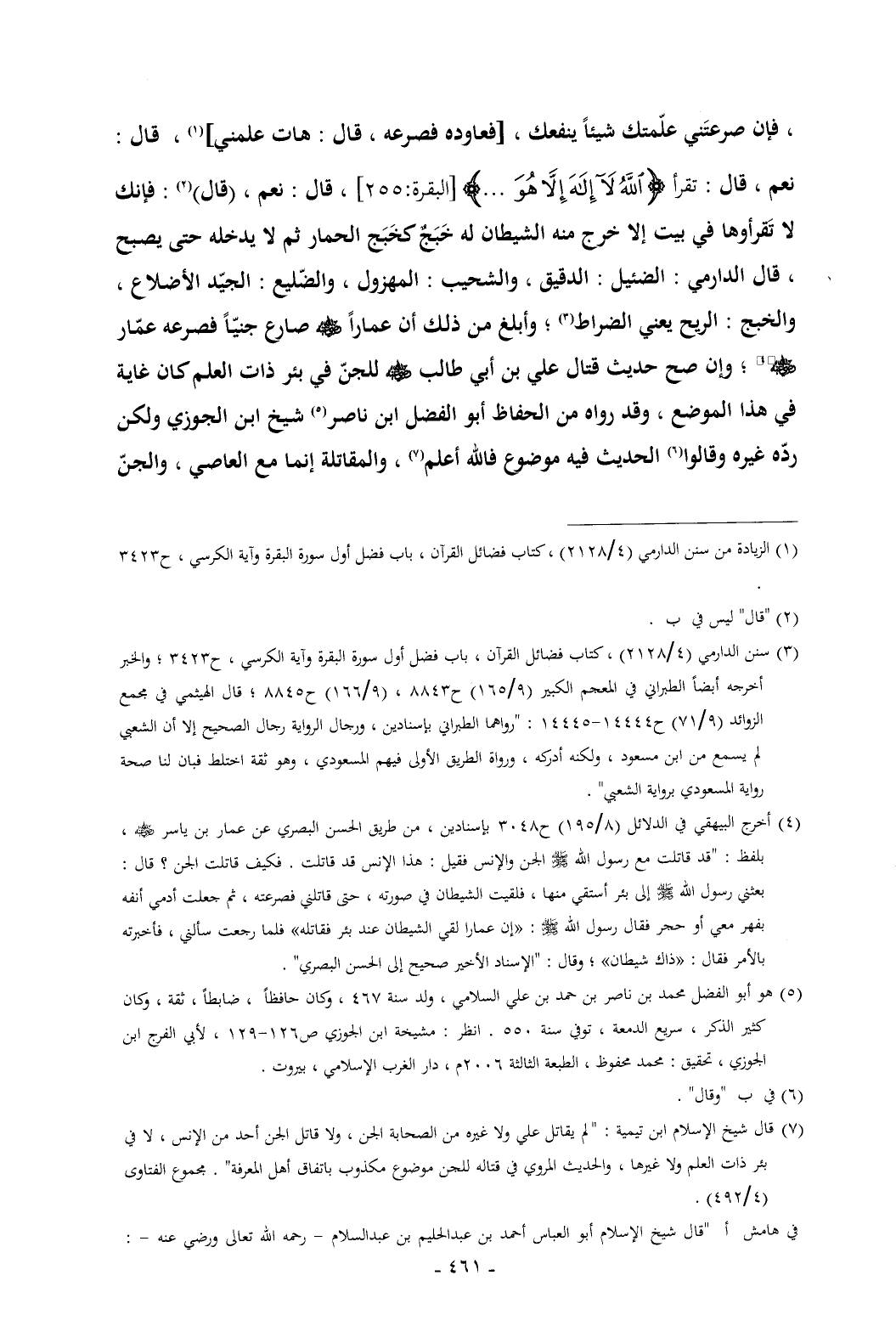 في هامش أ "قال شيخ الإسلام أبو العباس أحمد بن عبدالحليم بن عبدالسلام - رحمه الله تعالى ورضي عنه -: الحديث المروي في قتال أمير المؤمنين علي - رضي الله عنه - للجن موضوع مكذوب باتفاق أهل المعرفة".