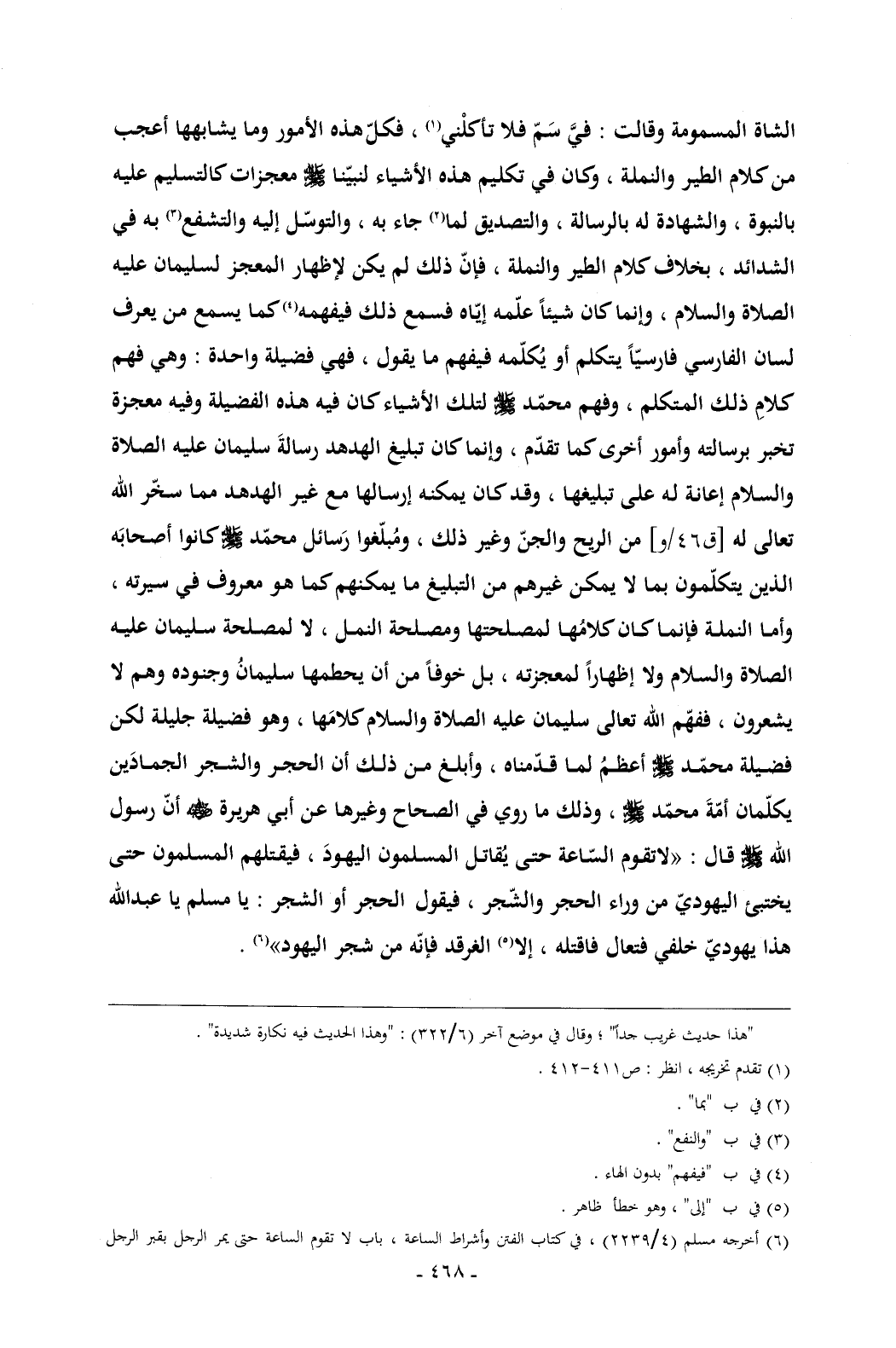 الشاة المسمومة وقالت: فيَّ سَمّ فلا تأكلْني (¬1) , فكلّ هذه الأمور وما يشابهها أعجب من كلام الطير والنملة , وكان في تكليم هذه الأشياء لنبيّنا - صلى الله عليه وسلم - معجزات كالتسليم عليه بالنبوة , والشهادة له بالرسالة , والتصديق لما (¬2) جاء به , والتوسّل إليه والتشفع (¬3) به في الشدائد , بخلاف كلام الطير والنملة , فإنّ ذلك لم يكن لإظهار المعجز لسليمان عليه الصلاة والسلام , وإنما كان شيئاً علّمه إيّاه فسمع ذلك فيفهمه (¬4) كما يسمع من يعرف لسان الفارسي فارسيّاً يتكلم أو يُكلّمه فيفهم ما يقول , فهي فضيلة واحدة: وهي فهم كلامِ ذلك المتكلم , وفهم محمّد - صلى الله عليه وسلم - لتلك الأشياء كان فيه هذه الفضيلة وفيه معجزة تخبر برسالته وأمور أخرى كما تقدّم , وإنما كان تبليغ الهدهد رسالةَ سليمان عليه الصلاة والسلام إعانة له على تبليغها , وقد كان يمكنه إرسالها مع غير الهدهد مما سخّر الله تعالى له [ق 46/و] من الريح والجنّ وغير ذلك , ومُبلّغوا رَسائل محمّد - صلى الله عليه وسلم - كانوا أصحابَه الذين يتكلّمون بما لا يمكن غيرهم من التبليغ ما يمكنهم كما هو معروف في سيرته , وأما النملة فإنما كان كلامُها لمصلحتها ومصلحة النمل , لا لمصلحة سليمان عليه الصلاة والسلام ولا إظهاراً لمعجزته , بل خوفاً من أن يحطمها سليمانُ وجنوده وهم لا يشعرون , ففهّم الله تعالى سليمان عليه الصلاة والسلام كلامَها , وهو فضيلة جليلة لكن فضيلة محمّد - صلى الله عليه وسلم - أعظمُ لما قدّمناه , وأبلغ من ذلك أن الحجر والشجر الجمادَين يكلّمان أمّةَ محمّد - صلى الله عليه وسلم - , وذلك ما روي في الصحاح وغيرها عن أبي هريرة - رضي الله عنه - أنّ رسول الله - صلى الله عليه وسلم - قال: «لاتقوم السّاعة حتى يُقاتل المسلمون اليهودَ , فيقتلهم المسلمون حتى يختبئ اليهوديّ من وراء الحجر والشّجر , فيقول الحجر أو الشجر: يا مسلم يا عبدالله هذا يهوديّ خلفي فتعال فاقتله , إلا (¬5) الغرقد فإنّه من شجر اليهود» (¬6).