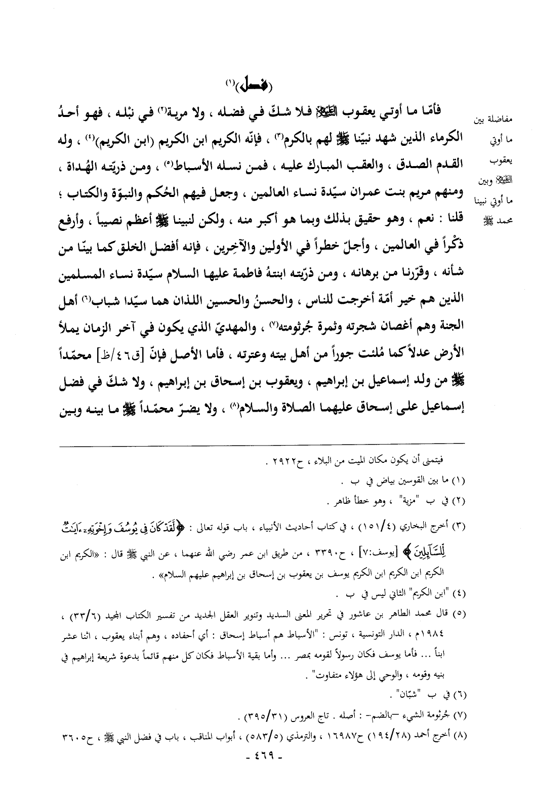 وله القدم الصدق , والعقب المبارك عليه , فمن نسله الأسباط (¬5) , ومن ذريّته الهُداة , ومنهم مريم بنت عمران سيّدة نساء العالمين , وجعل فيهم الحُكم والنبوّة والكتاب؛ قلنا: نعم , وهو حقيق بذلك وبما هو أكبر منه , ولكن لنبينا - صلى الله عليه وسلم - أعظم نصيباً , وأرفع ذكْراً في العالمين , وأجلّ خطراً في الأولين والآخِرين , فإنه أفضل الخلق كما بينّا من شأنه , وقرّرنا من برهانه , ومن ذرّيته ابنتهُ فاطمة عليها السلام سيّدة نساء المسلمين الذين هم خير أمّة أخرجت للناس , والحسنُ والحسين اللذان هما سيّدا شباب (¬6) أهل الجنة وهم أغصان شجرته وثمرة جُرثومته (¬7) , والمهديّ الذي يكون في آخر الزمان يملأ الأرض عدلاً كما مُلئت جوراً من أهل بيته وعترته , فأما الأصل فإنّ [ق 46/ظ] محمّداً - صلى الله عليه وسلم - من ولد إسماعيل بن إبراهيم , ويعقوب بن إسحاق بن إبراهيم , ولا شكّ في فضل إسماعيل على إسحاق عليهما الصلاة والسلام (¬8) , ولا يضرّ محمّداً - صلى الله عليه وسلم - ما بينه وبين