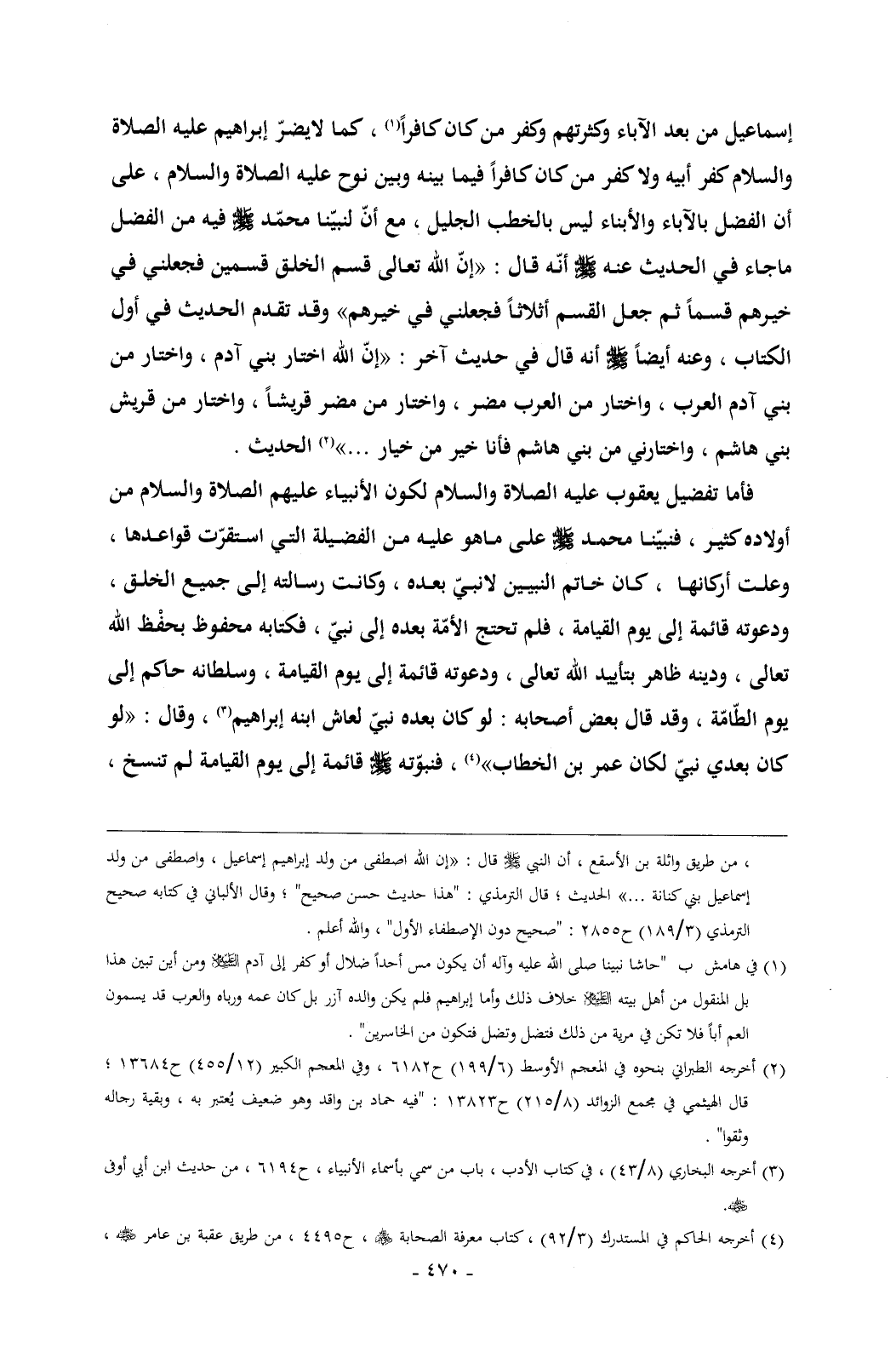 إسماعيل من بعد الآباء وكثرتهم وكفر من كان كافراً (¬1) , كما لايضرّ إبراهيم عليه الصلاة والسلام كفر أبيه ولا كفر من كان كافراً فيما بينه وبين نوح عليه الصلاة والسلام , على أن الفضل بالآباء والأبناء ليس بالخطب الجليل , مع أنّ لنبيّنا محمّد - صلى الله عليه وسلم - فيه من الفضل ماجاء في الحديث عنه - صلى الله عليه وسلم - أنّه قال: «إنّ الله تعالى قسم الخلق قسمين فجعلني في
