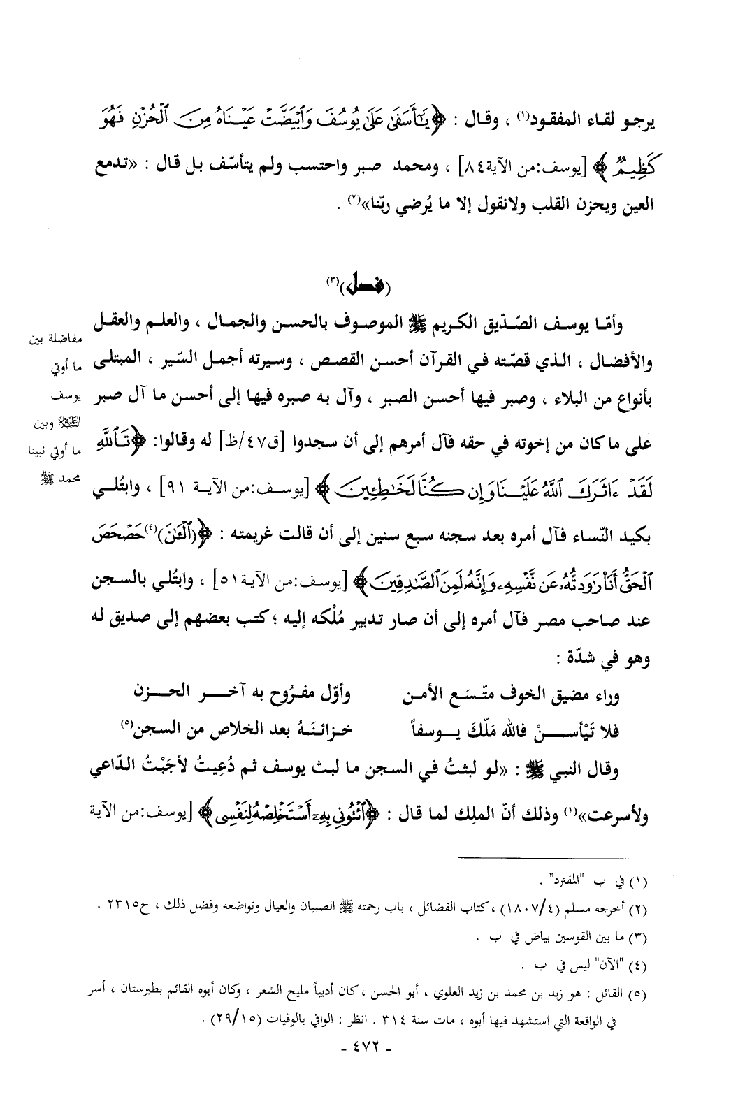 (¬5) القائل: هو زيد بن محمد بن زيد العلوي , أبو الحسن , كان أديباً مليح الشعر , وكان أبوه القائم بطبرستان , أسر في الواقعة التي استشهد فيها أبوه , مات سنة 314. انظر: الوافي بالوفيات (15/ 29).