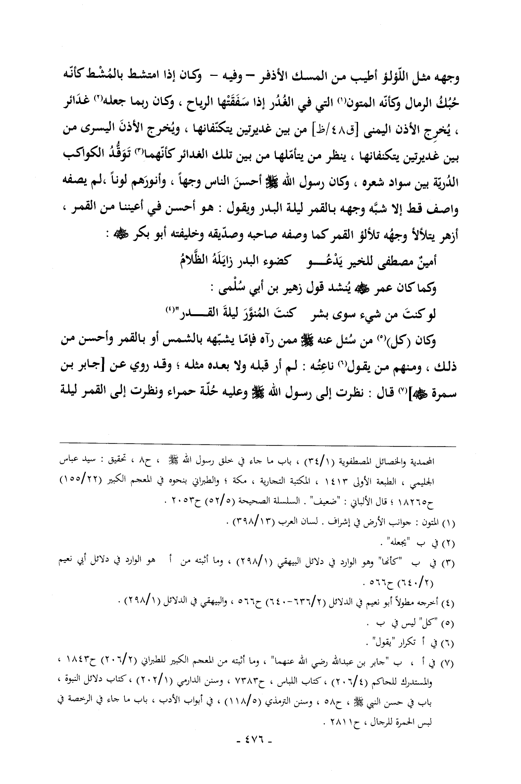وكان (كل) (¬5) من سُئل عنه - صلى الله عليه وسلم - ممن رآه فإمّا يشبّهه بالشمس أو بالقمر وأحسن من ذلك , ومنهم من يقول (¬6) ناعِتُه: لم أر قبله ولا بعده مثله؛ وقد روي عن [جابر بن سمرة - رضي الله عنه -] (¬7) قال: نظرت إلى رسول الله - صلى الله عليه وسلم - وعليه حُلّة حمراء ونظرت إلى القمر ليلة