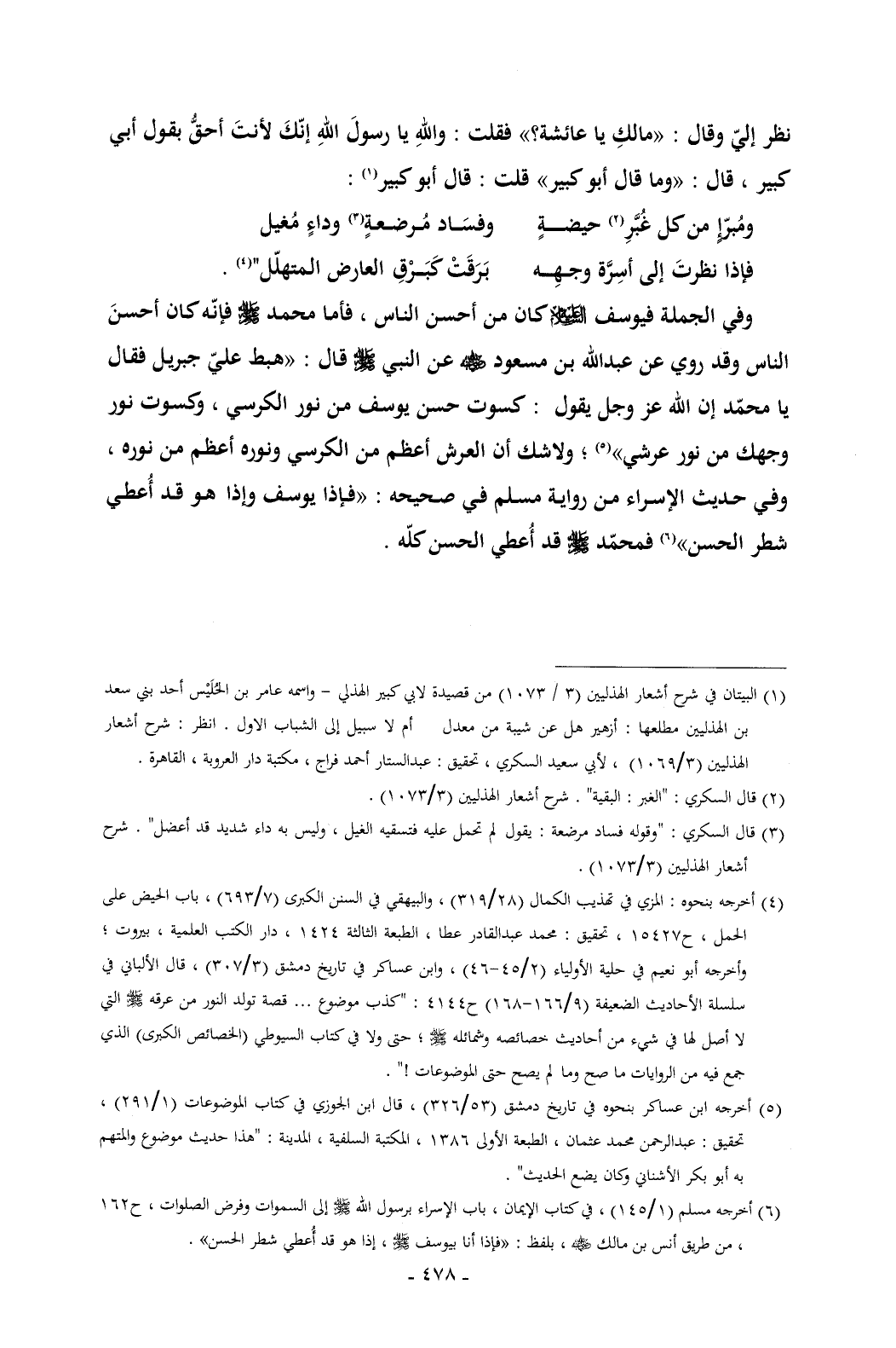 نظر إليّ وقال: «مالكِ يا عائشة؟ » فقلت: واللهِ يا رسولَ اللهِ إنّكَ لأنتَ أحقُّ بقول أبي كبير , قال: «وما قال أبو كبير» قلت: قال أبو كبير (¬1):