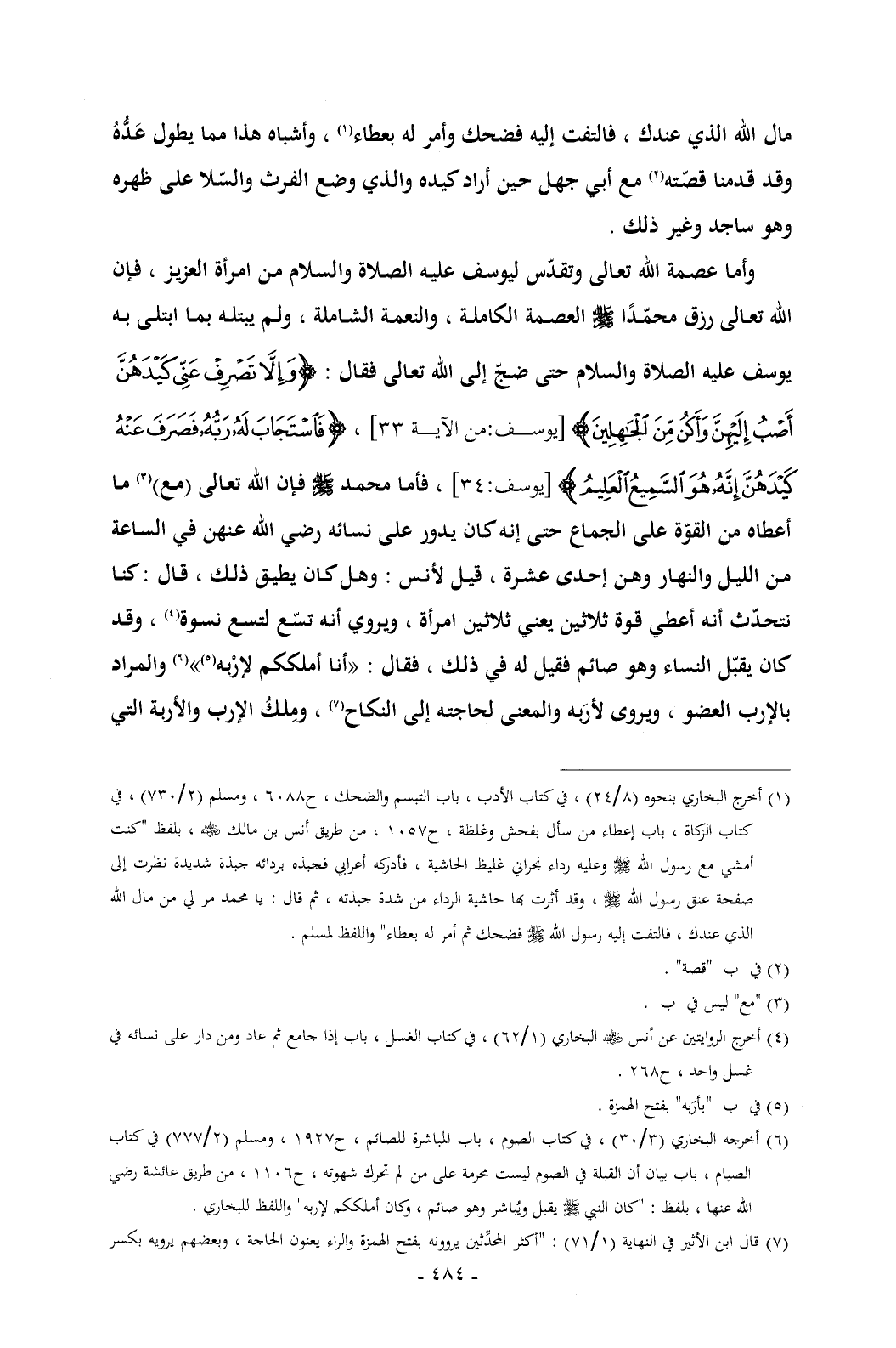 وأما عصمة الله تعالى وتقدّس ليوسف عليه الصلاة والسلام من امرأة العزيز , فإن الله تعالى رزق محمّدًا - صلى الله عليه وسلم - العصمة الكاملة , والنعمة الشاملة , ولم يبتله بما ابتلى به يوسف عليه الصلاة والسلام حتى ضجّ إلى الله تعالى فقال: {وَإِلَّا تَصْرِفْ عَنِّي كَيْدَهُنَّ أَصْبُ إِلَيْهِنَّ وَأَكُنْ مِنَ الْجَاهِلِينَ} [يوسف: من الآية 33] , {فَاسْتَجَابَ لَهُ رَبُّهُ فَصَرَفَ عَنْهُ كَيْدَهُنَّ إِنَّهُ هُوَ السَّمِيعُ الْعَلِيمُ} [يوسف: 34] , فأما محمد - صلى الله عليه وسلم - فإن الله تعالى (مع) (¬3) ما أعطاه من القوّة على الجماع حتى إنه كان يدور على نسائه رضي الله عنهن في الساعة من الليل والنهار وهن إحدى عشرة , قيل لأنس: وهل كان يطيق ذلك , قال: كنا نتحدّث أنه أعطي قوة ثلاثين يعني ثلاثين امرأة , ويروي أنه تسّع لتسع نسوة (¬4) , وقد كان يقبّل النساء وهو صائم فقيل له في ذلك , فقال: «أنا أملككم لإرْبه (¬5)» (¬6) والمراد بالإرب العضو , ويروى لأرَبه والمعنى لحاجته إلى النكاح (¬7) , ومِلكُ الإرب والأربة التي