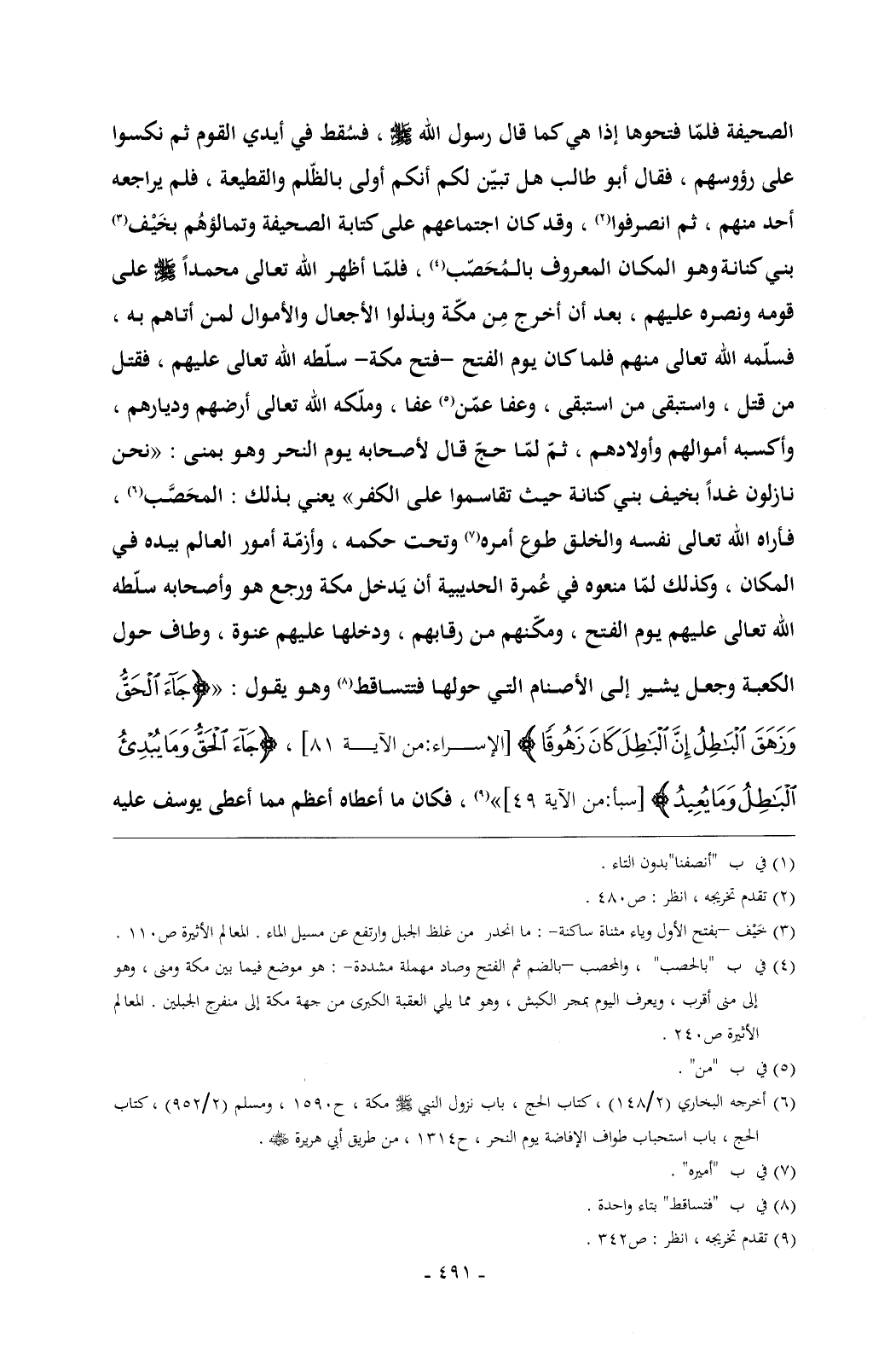 الصحيفة فلمّا فتحوها إذا هي كما قال رسول الله - صلى الله عليه وسلم - , فسُقط في أيدي القوم ثم نكسوا على رؤوسهم , فقال أبو طالب هل تبيّن لكم أنكم أولى بالظّلم والقطيعة , فلم يراجعه أحد منهم , ثم انصرفوا (¬1) , وقد كان اجتماعهم على كتابة الصحيفة وتمالؤهُم بخَيْف (¬2) بني كنانة وهو المكان المعروف بالمُحَصّب (¬3) , فلمّا أظهر الله تعالى محمداً - صلى الله عليه وسلم - على قومه ونصره عليهم , بعد أن أخرج مِن مكّة وبذلوا الأجعال والأموال لمن أتاهم به , فسلّمه الله تعالى منهم فلما كان يوم الفتح -فتح مكة- سلّطه الله تعالى عليهم , فقتل من قتل , واستبقى من استبقى , وعفا عمّن (¬4) عفا , وملّكه الله تعالى أرضهم وديارهم , وأكسبه أموالهم وأولادهم , ثمّ لمّا حجّ قال لأصحابه يوم النحر وهو بمنى: «نحن نازلون غداً بخيف بني كنانة حيث تقاسموا على الكفر» يعني بذلك: المحَصَّب (¬5) , فأراه الله تعالى نفسه والخلق طوع أمره (¬6) وتحت حكمه , وأزمّة أمور العالم بيده في المكان , وكذلك لمّا منعوه في عُمرة الحديبية أن يَدخل مكة ورجع هو وأصحابه سلّطه الله تعالى عليهم يوم الفتح , ومكّنهم من رقابهم , ودخلها عليهم عنوة , وطاف حول الكعبة وجعل يشير إلى الأصنام التي حولها فتتساقط (¬7) وهو يقول: «{جَاءَ الْحَقُّ وَزَهَقَ الْبَاطِلُ إِنَّ الْبَاطِلَ كَانَ زَهُوقًا} [الإسراء: من الآية 81] , {جَاءَ الْحَقُّ وَمَا يُبْدِئُ الْبَاطِلُ وَمَا يُعِيدُ} [سبأ: من الآية 49]» (¬8) , فكان ما أعطاه أعظم مما أعطى يوسف عليه
