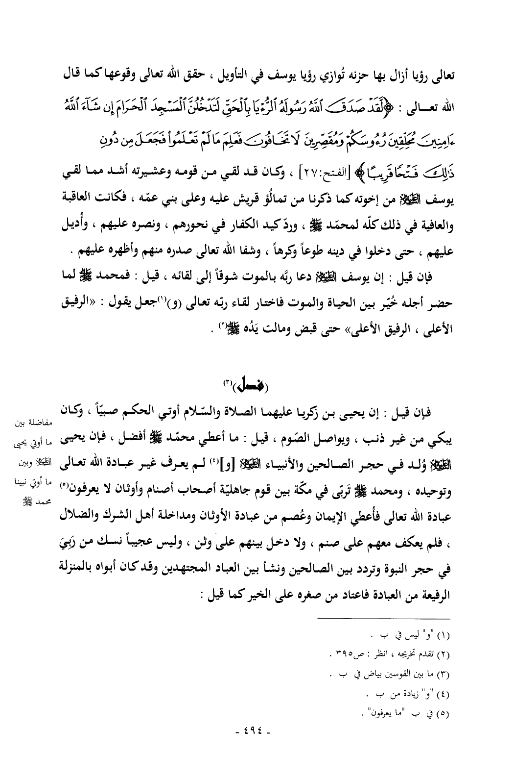 فإن قيل: إن يحيى بن زكريا عليهما الصلاة والسّلام أوتي الحكم صبيّاً , وكان يبكي من غير ذنب , ويواصل الصّوم , قيل: ما أعطي محمّد - صلى الله عليه وسلم - أفضل , فإن يحيى - عليه السلام - وُلد في حجر الصالحين والأنبياء - عليه السلام -[و] (¬4) لم يعرف غير عبادة الله تعالى وتوحيده , ومحمد - صلى الله عليه وسلم - تَربّى في مكّة بين قوم جاهليّة أصحاب أصنام وأوثان لا يعرفون (¬5) عبادة الله تعالى فأُعطي الإيمان وعُصم من عبادة الأوثان ومداخلة أهل الشرك والضلال , فلم يعكف معهم على صنم , ولا دخل بينهم على وثن , وليس عجيباً نسك من رَبِيَ في حجر النبوة وتردد بين الصالحين ونشأ بين العباد المجتهدين وقد كان أبواه بالمنزلة الرفيعة من العبادة فاعتاد من صغره على الخير كما قيل: