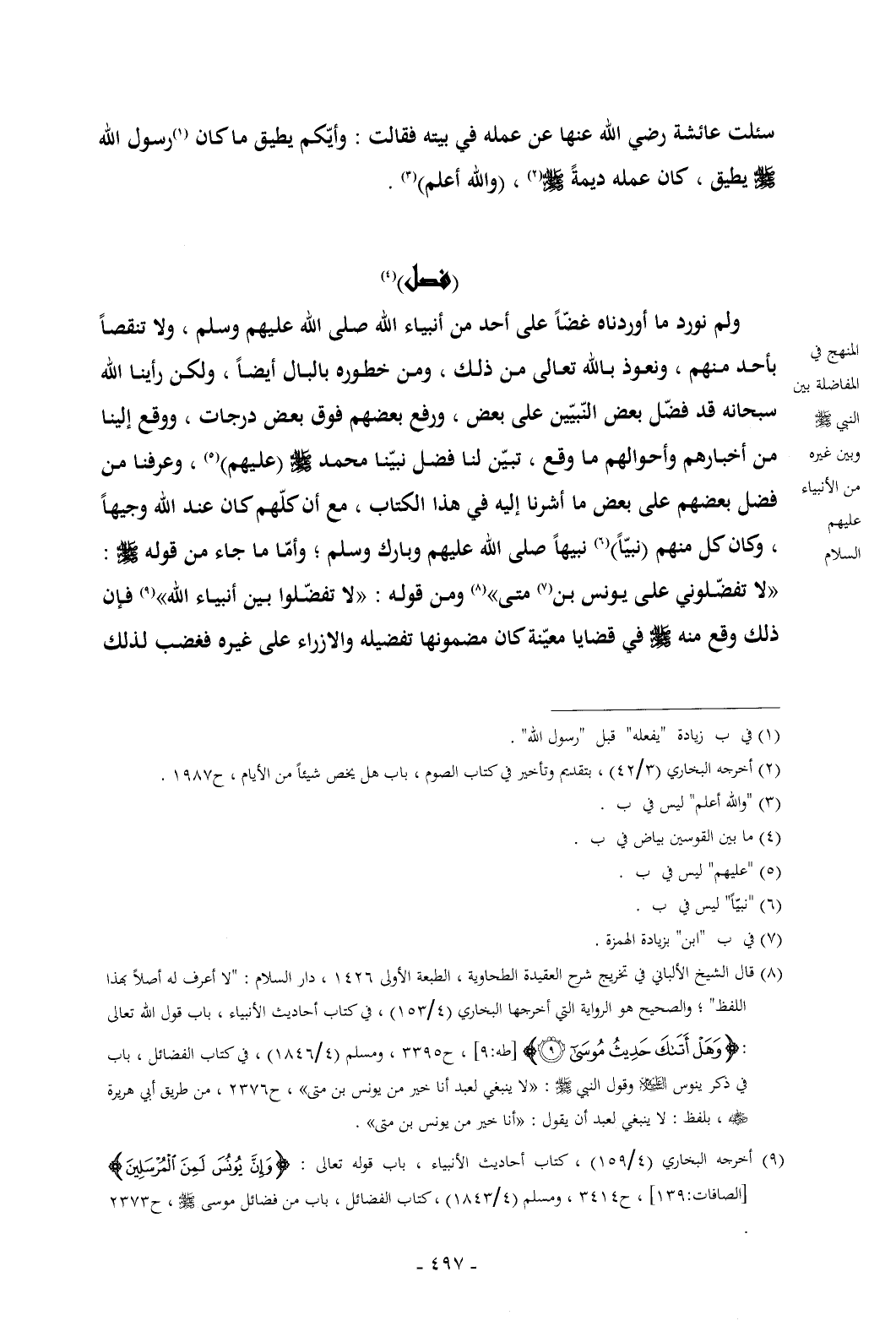(¬8) قال الشيخ الألباني في تخريج شرح العقيدة الطحاوية , الطبعة الأولى 1426 , دار السلام: "لا أعرف له أصلاً بهذا اللفظ"؛ والصحيح هو الرواية التي أخرجها البخاري (4/ 153) , في كتاب أحاديث الأنبياء , باب قول الله تعالى: {وَهَلْ أَتَاكَ حَدِيثُ مُوسَى (9)} [طه: 9] , ح 3395 , ومسلم (4/ 1846) , في كتاب الفضائل , باب في ذكر ينوس - عليه السلام - وقول النبي - صلى الله عليه وسلم -: «لا ينبغي لعبد أنا خير من يونس بن متى» , ح 2376 , من طريق أبي هريرة - رضي الله عنه - , بلفظ: لا ينبغي لعبد أن يقول: «أنا خير من يونس بن متى».