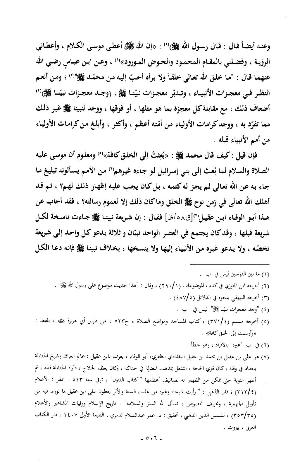 (¬7) هو علي بن عقيل بن محمد بن عقيل البغدادي الظفري، أبو الوفاء، يعرف بابن عقيل: عالم العراق وشيخ الحنابلة ببغداد في وقته , كان قوي الحجة، اشتغل بمذهب المعتزلة في حداثته , وكان يعظم الحلاج، فأراد الحنابلة قتله , ثم أظهر التوبة حتى تمكن من الظهور له تصانيف أعظمها " كتاب الفنون" , توفي سنة 513. انظر: الأعلام (4/ 313)؛ قال الذهبي: " رأيت شيخنا وغيره من علماء السنة والأثر يحطون على ابن عقيل لما تورط فيه من تأويل الجهمية، وتحريف النصوص، نسأل الله الستر والسلامة". تاريخ الإسلام ووفيات المشاهير والأعلام (35/ 353) , لشمس الدين الذهبي , تحقيق: د. عمر عبدالسلام تدمري , الطبعة الأولى 1407 , دار الكتاب العربي , بيروت.