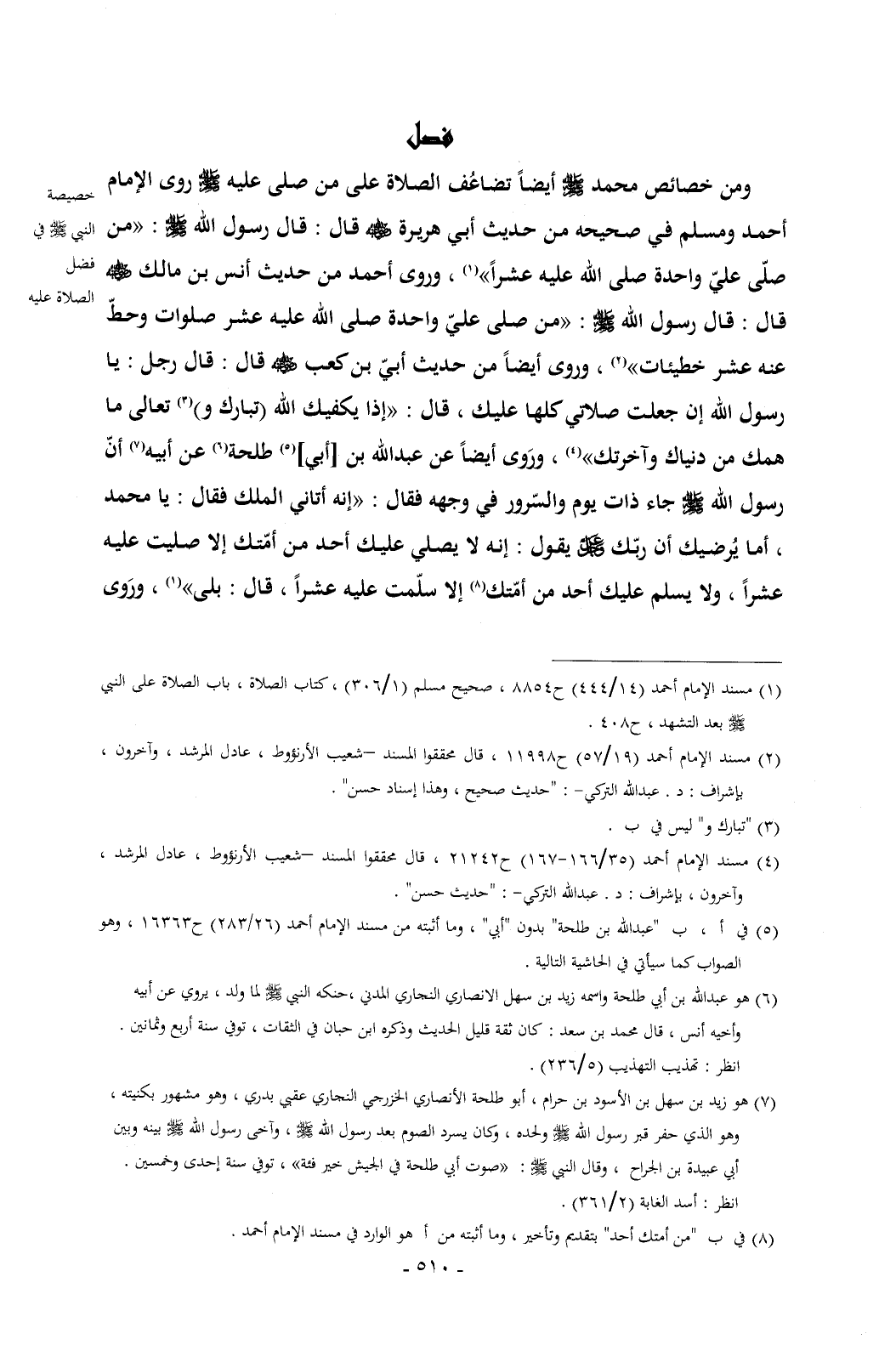 ومن خصائص محمد - صلى الله عليه وسلم - أيضاً تضاعُف الصلاة على من صلى عليه - صلى الله عليه وسلم - روى الإمام أحمد ومسلم في صحيحه من حديث أبي هريرة - رضي الله عنه - قال: قال رسول الله - صلى الله عليه وسلم -: «من صلّى عليّ واحدة صلى الله عليه عشراً» (¬1) , وروى أحمد من حديث أنس بن مالك - رضي الله عنه - قال: قال رسول الله - صلى الله عليه وسلم -: «من صلى عليّ واحدة صلى الله عليه عشر صلوات وحطّ عنه عشر خطيئات» (¬2) , وروى أيضاً من حديث أبيّ بن كعب - رضي الله عنه - قال: قال رجل: يا رسول الله إن جعلت صلاتي كلها عليك , قال: «إذا يكفيك الله (تبارك و) (¬3) تعالى ما همك من دنياك وآخرتك» (¬4) , ورَوى أيضاً عن عبدالله بن [أبي] (¬5) طلحة (¬6) عن أبيه (¬7) أنّ رسول الله - صلى الله عليه وسلم - جاء ذات يوم والسّرور في وجهه فقال: «إنه أتاني الملك فقال: يا