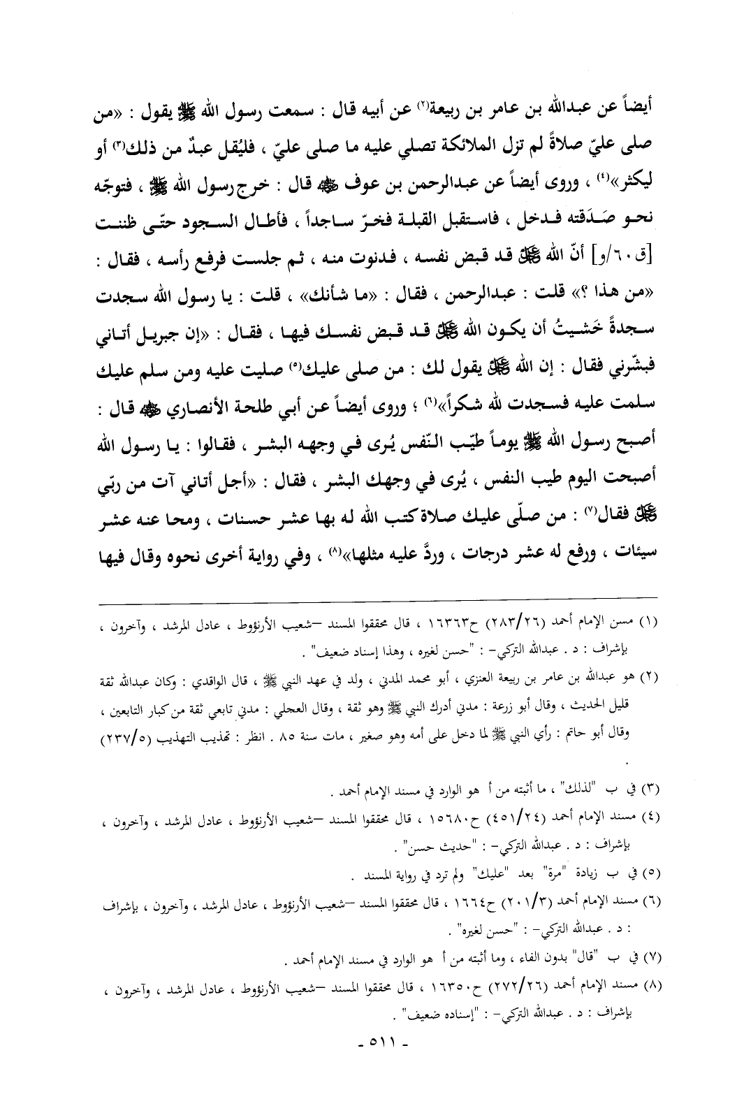 أيضاً عن عبدالله بن عامر بن ربيعة (¬1) عن أبيه قال: سمعت رسول الله - صلى الله عليه وسلم - يقول: «من صلى عليّ صلاةً لم تزل الملائكة تصلي عليه ما صلى عليّ , فليُقل عبدٌ من ذلك (¬2) أو ليكثر» (¬3) , وروى أيضاً عن عبدالرحمن بن عوف - رضي الله عنه - قال: خرج رسول الله - صلى الله عليه وسلم - , فتوجّه نحو صَدَقته فدخل , فاستقبل القبلة فخرّ ساجداً , فأطال السجود حتّى ظننت [ق 60/و] أنّ الله - عز وجل - قد قبض نفسه , فدنوت منه , ثم جلست فرفع رأسه , فقال: «من هذا؟ » قلت: عبدالرحمن , فقال: «ما شأنك» , قلت: يا رسول الله سجدت سجدةً خَشيتُ أن يكون الله - عز وجل - قد قبض نفسك فيها , فقال: «إن جبريل أتاني فبشّرني فقال: إن الله - عز وجل - يقول لك: من صلى عليك (¬4) صليت عليه ومن سلم عليك سلمت عليه فسجدت لله شكراً» (¬5)؛ وروى أيضاً عن أبي طلحة الأنصاري - رضي الله عنه - قال: أصبح رسول الله - صلى الله عليه وسلم - يوماً طيّب النّفس يُرى في وجهه البشر , فقالوا: يا رسول الله أصبحت اليوم طيب النفس , يُرى في وجهك البشر , فقال: «أجل أتاني آت من ربّي - عز وجل - فقال (¬6): من صلّى عليك صلاة كتب الله له بها عشر حسنات , ومحا عنه عشر سيئات , ورفع له عشر درجات , وردَّ عليه مثلها» (¬7) , وفي رواية أخرى نحوه وقال فيها: