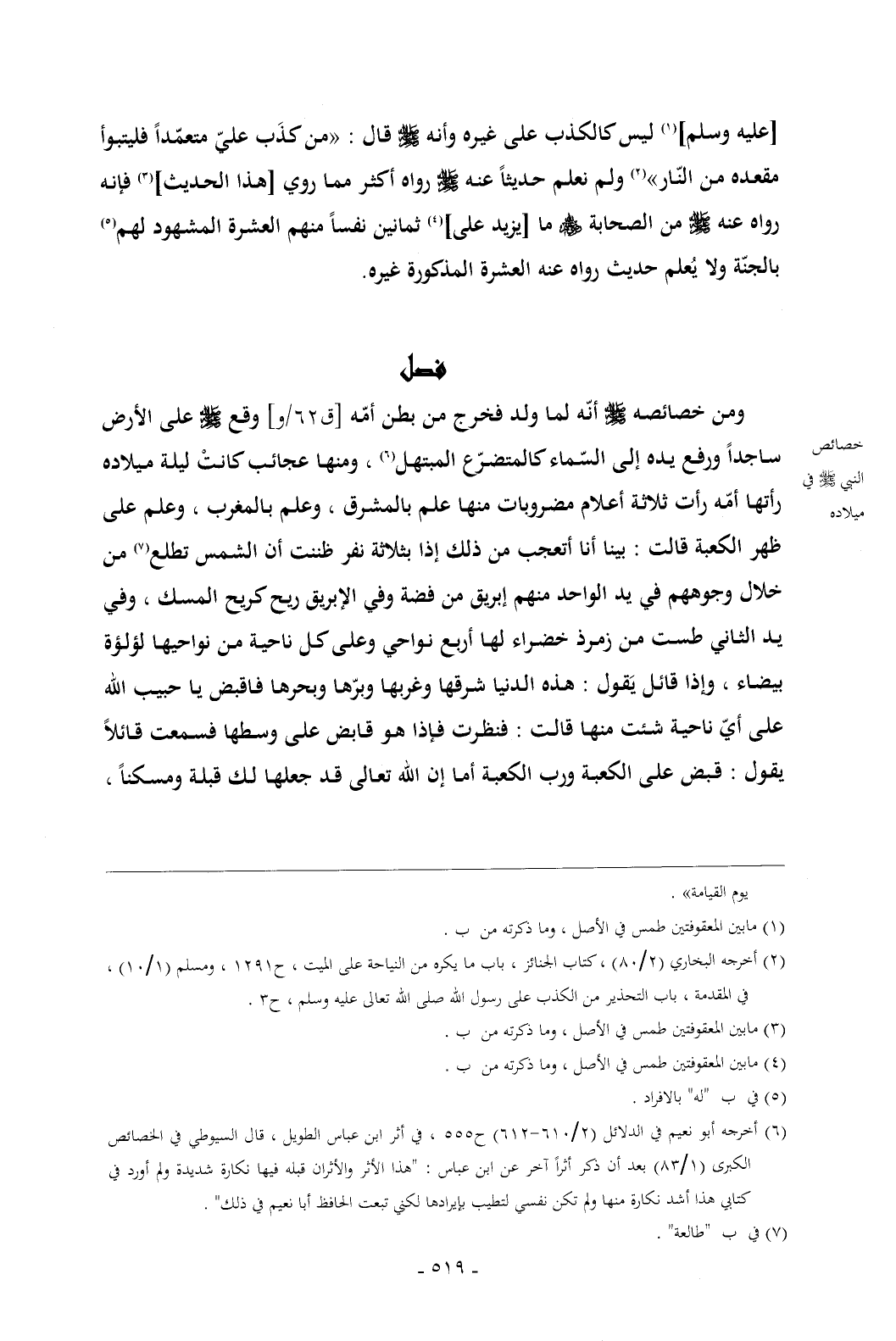 (¬6) أخرجه أبو نعيم في الدلائل (2/ 610 - 612) ح 555 , في أثر ابن عباس الطويل , قال السيوطي في الخصائص الكبرى (1/ 83) بعد أن ذكر أثراً آخر عن ابن عباس: "هذا الأثر والأثران قبله فيها نكارة شديدة ولم أورد في كتابي هذا أشد نكارة منها ولم تكن نفسي لتطيب بإيرادها لكني تبعت الحافظ أبا نعيم في ذلك".