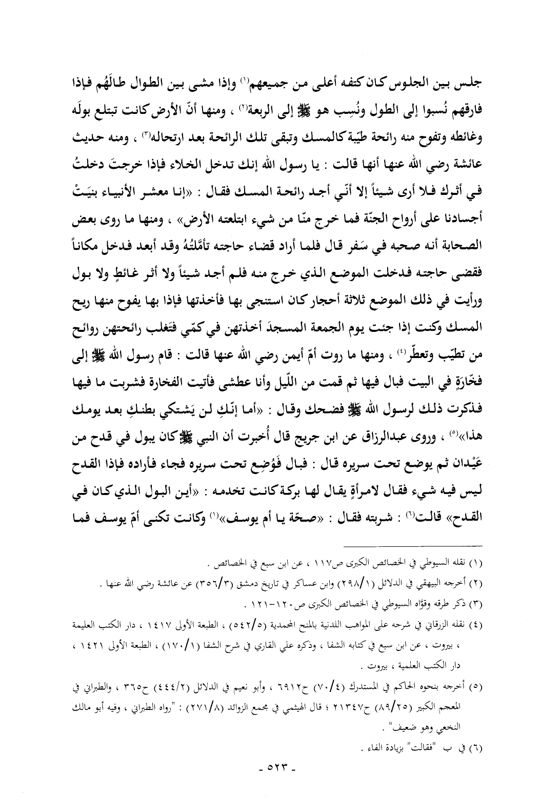 جلس بين الجلوس كان كتفه أعلى من جميعهم (¬1) وإذا مشى بين الطوال طالَهُم فإذا فارقهم نُسبوا إلى الطول ونُسِب هو - صلى الله عليه وسلم - إلى الربعة (¬2) , ومنها أنّ الأرض كانت تبتلع بولَه وغائطه وتفوح منه رائحة طيّبة كالمسك وتبقى تلك الرائحة بعد ارتحاله (¬3) , ومنه حديث عائشة رضي الله عنها أنها قالت: يا رسول الله إنك تدخل الخلاء فإذا خرجتَ دخلتُ في أثرك فلا أرى شيئاً إلا أنّي أجد رائحة المسك فقال: «إنا معشر الأنبياء بنيَتْ أجسادنا على أرواح الجنّة فما خرج منّا من شيء ابتلعته الأرض» , ومنها ما روى بعض الصحابة أنه صحبه في سَفر قال فلما أراد قضاء حاجته تأمَّلتُهُ وقد أبعد فدخل مكاناً فقضى حاجته فدخلت الموضع الذي خرج منه فلم أجد شيئاً ولا أثر غائطٍ ولا بول ورأيت في ذلك الموضع ثلاثة أحجار كان استنجى بها فأخذتها فإذا بها يفوح منها ريح المسك وكنت إذا جئت يوم الجمعة المسجدَ أخذتهن في كمّي فتَغلب رائحتهن روائح من تطيّب وتعطّر (¬4) , ومنها ما روت أمّ أيمن رضي الله عنها قالت: قام رسول الله - صلى الله عليه وسلم - إلى فخّارَةٍ في البيت فبال فيها ثم قمت من اللّيل وأنا عطشى فأتيت الفخارة فشربت ما فيها فذكرت ذلك لرسول الله - صلى الله عليه وسلم - فضحك وقال: «أما إنّكِ لن يَشتكي بطنكِ بعد يومك هذا» (¬5) , وروى عبدالرزاق عن ابن جريج قال أُخبرت أن النبي - صلى الله عليه وسلم - كان يبول في قدح من عَيْدان ثم يوضع تحت سريره قال: فبال فَوُضِع تحت سريره فجاء فأراده فإذا القدح ليس فيه شيء فقال لامرأةٍ يقال لها بركة كانت تخدمه: «أين البول الذي كان في القدح» قالت (¬6): شربته فقال: «صحّة يا أم يوسف» (¬7) وكانت تكنى