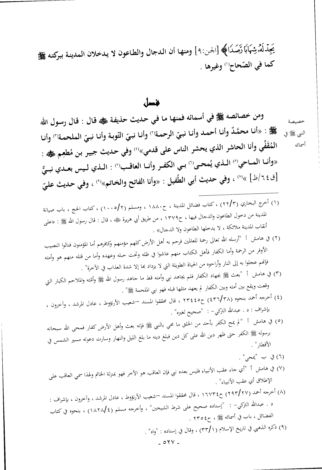 ومن خصائصه - صلى الله عليه وسلم - في أسمائه فمنها ما في حديث حذيفة - رضي الله عنه - قال: قال رسول الله - صلى الله عليه وسلم -: «أنا محمَّدٌ وأنا أحمد وأنا نبيّ الرحمة (¬2) وأنا نبيّ التّوبة وأنا نبيّ الملحمة (¬3) وأنا المُقَفِّي وأنا الحاشر الذي يحشر الناس على قدمي» (¬4) وفي حديث جبير بن مُطعِم - رضي الله عنه -: «وأنا الماحي (¬5) الذي يُمحى (¬6) بي الكفر وأنا العاقب (¬7): الذي ليس بعدي نبيٌّ