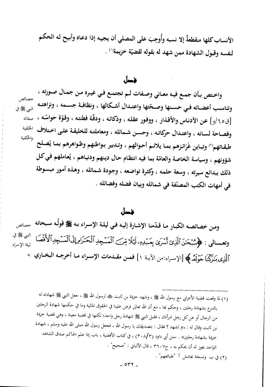واختص بأن جمع فيه معاني وصفات لم تجتمع في غيره من جمال صورته , وتناسب أعضائه في حسنها وصحّتها واعتدال أشكالها , ونظافة جسمه , ونزاهته [ق 65/و] عن الأدناس والأقذار , ووفور عقله , وذكائه , ودقّة فطنته , وقوّة حواسّه , وفصاحة لسانه , واعتدال حركاته , وحسن شمائله , ومعاملته للخليقة على اختلاف طبقاتهم (¬2) وتباين غَرَائزهم بما يلائم أحوالهم , وتدبير بواطنهم وظواهرهم بما يُصلح شؤونهم , وسياسة الخاصة والعامّة بما فيه انتظام حال دينهم ودنياهم , يُعاملهم في كل ذلك ببدائع سيرته , وسعة حلمه , وكثرة تواضعه , وجودة شمائله , وهذه أمور مبسوطة في أمهات الكتب المصنّفة في شمائله وبيان فضله وفضائله.
