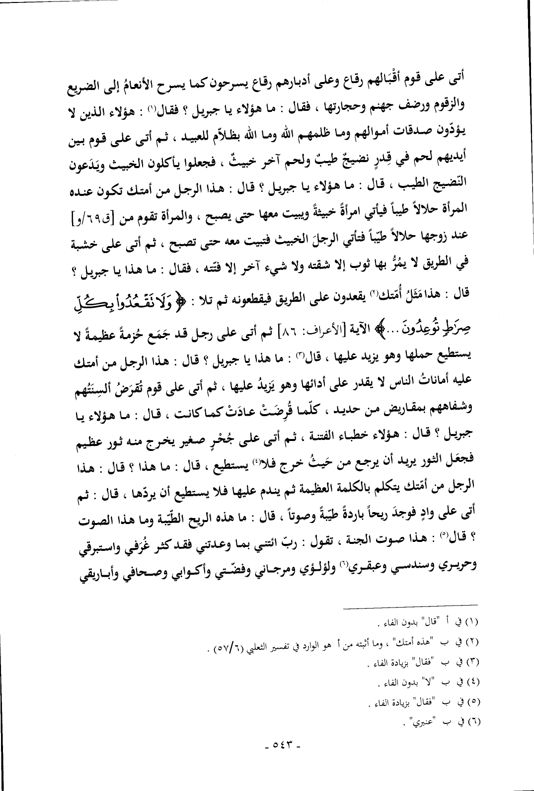 أتى على قوم أقْبَالهم رقاع وعلى أدبارهم رقاع يسرحون كما يسرح الأنعامُ إلى الضريع والزقوم ورضف جهنم وحجارتها , فقال: ما هؤلاء يا جبريل؟ فقال (¬1): هؤلاء الذين لا يؤدّون صدقات أموالهم وما ظلمهم الله وما الله بظلاّم للعبيد , ثم أتى على قوم بين أيديهم لحم في قِدرٍ نضيجٌ طيبٌ ولحم آخر خبيثٌ , فجعلوا يأكلون الخبيث ويَدَعون النّضيج الطيب , قال: ما هؤلاء يا جبريل؟ قال: هذا الرجل من أمتك تكون عنده المرأة حلالاً طيباً فيأتي امرأةً خبيثةً ويبيت معها حتى يصبح , والمرأة تقوم من [ق 69/و] عند زوجها حلالاً طيّباً فتأتي الرجلَ الخبيث فتبيت معه حتى تصبح , ثم أتى على خشبة في الطريق لا يمُرُّ بها ثوب إلا شقته ولا شيء آخر إلا فتّته , فقال: ما هذا يا جبريل؟ قال: هذا مَثَلُ أُمّتك (¬2) يقعدون على الطريق فيقطعونه ثم تلا: {وَلَا تَقْعُدُوا بِكُلِّ صِرَاطٍ تُوعِدُونَ ... } الآية [الأعراف: 86] ثم أتى على رجل قد جَمَع حُزمةً عظيمةً لا يستطيع حملها وهو يزيد عليها , قال (¬3): ما هذا يا جبريل؟ قال: هذا الرجل من أمتك عليه أماناتُ الناس لا يقدر على أدائها وهو يَزيدُ عليها , ثم أتى على قوم تُقرَضُ ألسِنَتُهم وشفاههم بمقاريض