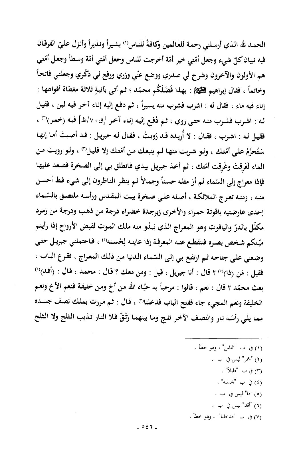 الحمد لله الذي أرسلني رحمة للعالمين وكافةً للناس (¬1) بشيراً ونذيراً وأنزل عليّ الفرقان فيه تبيان كلّ شيء وجعل أمّتي خير أمّة أخرجت للناس وجعل أمّتي أمّة وسطاً وجعل أمّتي هم الأولون والآخرون وشرح لي صدري ووضع عنّي وزري ورفع لي ذكْري وجعلني فاتحاً وخاتماً , فقال إبراهيم - عليه السلام -: بهذا فَضَلَكُم محمّد؛ ثم أتى بآنيةٍ ثلاثة مغطاة أفواهها: إناء فيه ماء , فقال له: اشرب فشرب منه يسيراً , ثم دفع إليه إناء آخر فيه لبن , فقيل له: اشرب فشرب منه حتى روي , ثم دُفع إليه إناء آخر [ق 70/ظ] فيه (خمر) (¬2) , فقيل له: اشرب , فقال: لا أُريده قد رَويتُ , فقال له جبريل: قد أصبتَ أما إنها سَتُحرَّمُ على أمّتك , ولو شربت منها لم يتبعك من أمّتك إلا قليل (¬3) , ولو رويت من الماء لَغَرِقتَ وغَرِقت أمّتك , ثم أخذ جبريل بيدي فانطلق بي إلى الصخرة فصعد عليها فإذا معراج إلى السّماء لم أرَ مثله حسناً وجمالاً لم ينظر الناظرون إلى شيء قط أحسن منه , ومنه تعرج الملائكة , أصله على صخرة بيت المقدس ورأسه ملتصق بالسّماء إحدى عارضتيه ياقوتة حمراء والأخرى زبرجدة خضراء درجة من ذهب ودرجة من زمرد مكلّل بالدرّ والياقوت وهو المعراج الذي يَبدُو منه ملك الموت لقبض الأرواح إذا رأيتم ميّتكم
