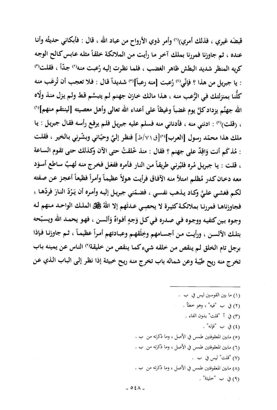 وحيّاني وبشّرني بالخير , فقلت: مُذ كَم أنت وَاقِدٌ على جهنم؟ فقال: منذ خُلقتُ حتى الآن وكذلك حتى تقوم الساعة , قلت: يا جبريل مُره فليُرني طريقاً من النار فأمره ففعَل فخرج منه لهبٌ ساطع أسوَد معه دخان كدر مُظلم امتلأ منه الآفاق فرأيت هولاً عظيماً وأمراً فظيعاً أعجز عن صفته لكم فغشي عليَّ وكاد يذهب نفسي , فضمّني جبريل إليه وأمره أن يَرُدّ النارَ فردّها , فجاوزناها فمررنا بملائكة كثيرة لا يحصِي عدتَهم إلا اللهُ - عز وجل - الملك الواحد منهم له وجوه بين كتفيه ووجوه في صدره في كل وَجهٍ أفواهٌ وَألسن , فهو يحمد الله ويسبّحه بتلك الألسن , ورأيت من أجسامهم وخِلَقهم وعبادتهم أمراً عظيماً , ثم جاوزنا فإذا برجل تام الخلق لم ينقص من خلقه شيء كما ينقص من خليقة (¬9) الناس عن يمينه باب تخرج منه ريح طيّبة وعن شماله باب تخرج منه ريح خبيثة إذا نظر إلى الباب الذي عن