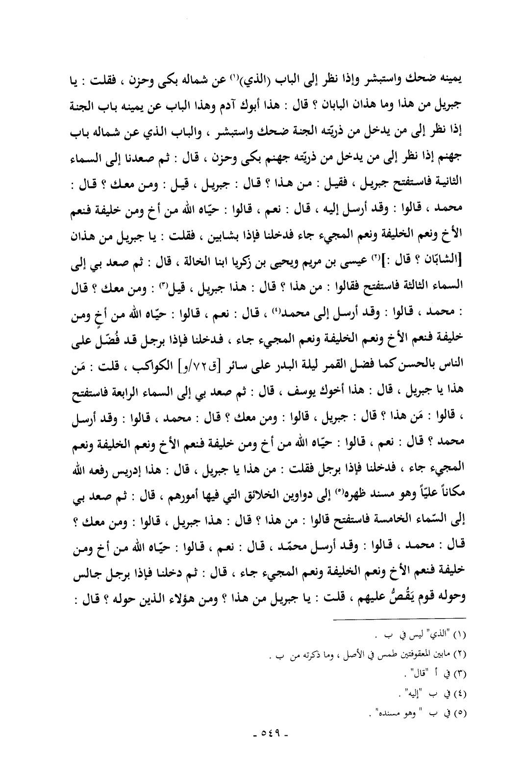 , قلت: مَن هذا يا جبريل , قال: هذا أخوك يوسف , قال: ثم صعد بي إلى السماء الرابعة فاستفتح , قالوا: مَن هذا؟ قال: جبريل , قالوا: ومن معك؟ قال: محمد , قالوا: وقد أرسل محمد؟ قال: نعم , قالوا: حيّاه الله من أخ ومن خليفة فنعم الأخ ونعم الخليفة ونعم المجيء جاء , فدخلنا فإذا برجل فقلت: من هذا يا جبريل , قال: هذا إدريس رفعه الله مكاناً عليّاً وهو مسند ظهره (¬5) إلى دواوين الخلائق التي فيها أمورهم , قال: ثم صعد بي إلى السّماء الخامسة فاستفتح قالوا: من هذا؟ قال: هذا جبريل , قالوا: ومن معك؟ قال: محمد , قالوا: وقد أرسل محمّد , قال: نعم , قالوا: حيّاه الله من أخ ومن خليفة فنعم الأخ ونعم الخليفة ونعم المجيء جاء , قال: ثم دخلنا فإذا برجل جالس وحوله قوم يَقُصُّ عليهم , قلت: يا جبريل من هذا؟ ومن هؤلاء الذين حوله؟ قال: