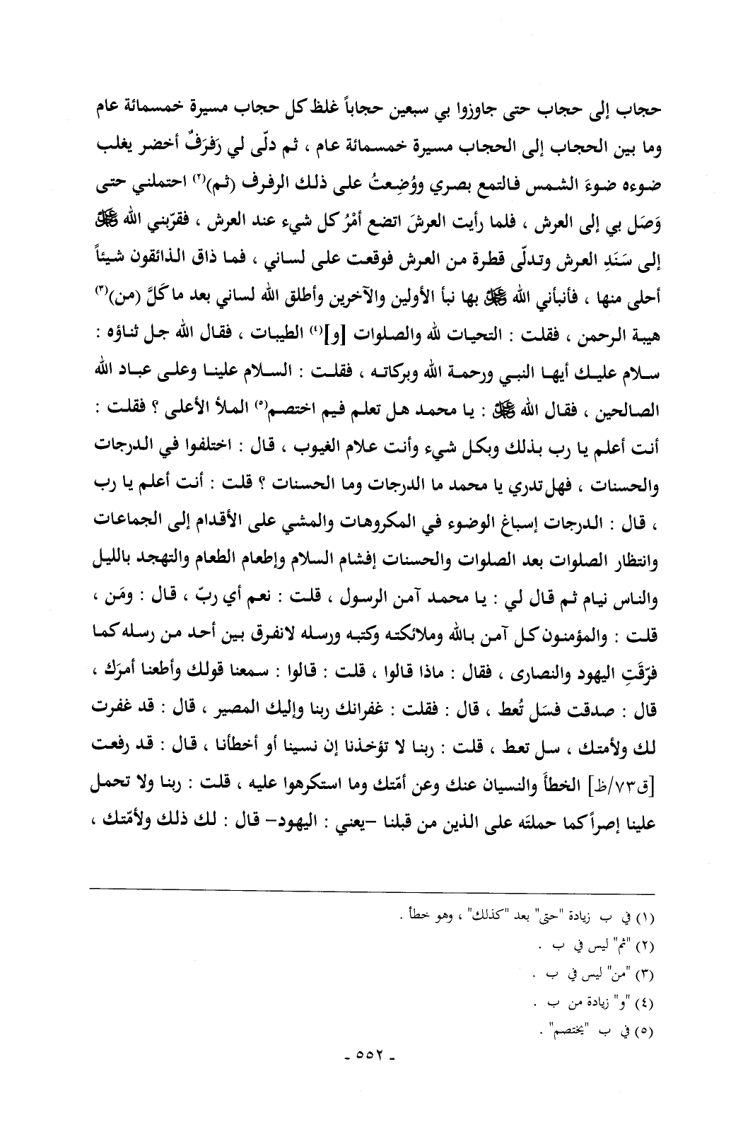 الدرجات والحسنات , فهل تدري يا محمد ما الدرجات وما الحسنات؟ قلت: أنت أعلم يا رب , قال: الدرجات إسباغ الوضوء في المكروهات والمشي على الأقدام إلى الجماعات وانتظار الصلوات بعد الصلوات والحسنات إفشام السلام وإطعام الطعام والتهجد بالليل والناس نيام ثم قال لي: يا محمد آمن الرسول , قلت: نعم أي ربّ , قال: ومَن , قلت: والمؤمنون كل آمن بالله وملائكته وكتبه ورسله لانفرق بين أحد من رسله كما فرّقَتِ اليهود والنصارى , فقال: ماذا قالوا , قلت: قالوا: سمعنا قولك وأطعنا أمرَك , قال: صدقت فسَل تُعط , قال: فقلت: غفرانك ربنا وإليك المصير , قال: قد غفرت لك ولأمتك , سل تعط , قلت: ربنا لا تؤخذنا إن نسينا أو أخطأنا , قال: قد رفعت [ق 73/ظ] الخطأَ والنسيان عنك وعن أمّتك وما استكرهوا عليه , قلت: ربنا ولا تحمل علينا إصراً كما حملتَه على الذين من قبلنا -يعني: اليهود- قال: لك ذلك ولأمّتك ,