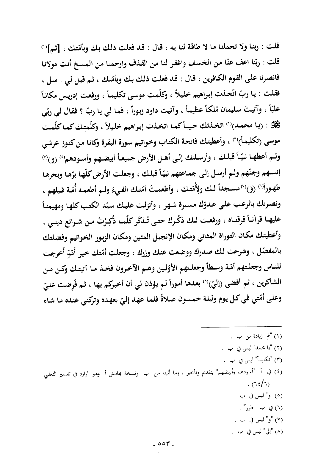 قلت: ربنا ولا تحملنا ما لا طاقة لنا به , قال: قد فعلت ذلك بك وبأمّتك , [ثم] (¬1) قلت: ربّنا اعف عنّا من الخسف واغفر لنا من القذف وارحمنا من المسخ أنت مولانا فانصرنا على القوم الكافرين , قال: قد فعلت ذلك بك وبأمّتك , ثم قيل لي: سل , فقلت: يا ربّ اتّخذت إبراهيم خليلاً , وكلّمت موسى تكليماً , ورفعت إدريس مكاناً عليّاً , وآتيتَ سليمان مُلكاً عظيماً , وآتيت داود زبوراً , فما لي يا ربّ؟ فقال لي ربّي - عز وجل -: (يا محمد) (¬2) اتخذتك حبيباً كما اتخذت إبراهيم خليلاً , وكلّمتك كما كلّمت موسى (تكليماً) (¬3) , وأعطيتك فاتحة الكتاب وخواتيم سورة البقرة وكانا من كنوز عرشي ولم أعطها نبيّاً قبلك , وأرسلتك إلى أهل الأرض جميعاً أبيضهم وأسودهم (¬4) (و) (¬5) إنسهم وجنّهم ولم أرسل إلى جماعتهم نبيّاً قبلك , وجعلت الأرض كلّها برّها وبحرها طهوراً (¬6) (وَ) (¬7) مسجداً لك ولِأُمّتك , وأطعمتُ أمّتك الفيءَ ولم أطعمه أُمّة قبلهم , ونصرتك بالرعب على عدوّك مسيرة شهر , وأنزلت عليك سيّد الكتب كلها ومهيمناً عليها قرآناً قرقناه , ورفعت لك ذكْرك حتى تُذكَر كلّما ذُكِرْتُ من شرائع ديني , وأعطيتك مكان التوراة المثاني ومكان الإنجيل المئين ومكان الزبور الخواتيم وفضلتك بالمفصّل , وشرحت لك صدرك ووضعت عنك وزرك , وجعلت أمّتك خير أُمّةٍ أُخرجت للناس وجعلتهم أمّة وسطاً وجعلتهم الأوّلين وهم الآخرون فخذ ما آتيتك وكن من الشاكرين , ثم أفضى (إليّ) (¬8) بعدها أموراً لم يؤذن لي أن أخبركم بها , ثم فُرِضت عليّ وعلى أمّتي في كل يوم وليلة خمسون صلاةً فلما عهد إليّ بعهده وتركني عنده ما شاء
