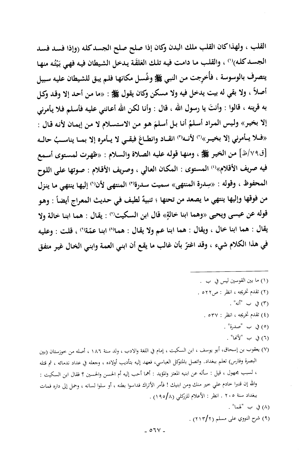 القلب , ولهذا كان القلب ملك البدن وكان إذا صلح صلح الجسد كله (وإذا فسد فسد الجسد كله) (¬1) , والقلب ما دامت فيه تلك العَلقَة يدخل الشيطان فيه فهي بَيْتُه منها يتصرف بالوسوسة , فأُخرِجت من النبي - صلى الله عليه وسلم - وغُسل مكانها فلم يبق للشيطان عليه سبيل أصلاً , ولا بقي له بيت يدخل فيه ولا مسكن وكان يقول - صلى الله عليه وسلم -: «ما من أحد إلا وقد وكل به قرينه , قالوا: وأنتَ يا رسول الله , قال: وأنا لكن الله أعانني عليه فأسلم فلا يأمرني إلا بخير» وليس المراد أسلمُ أنا بل أسلمَ هو من الاستسلام لا من إيمان لأنه قال: «فلا يأمرني إلا بخير» (¬2) لأنه (¬3) انقاد وانطاعَ فبقي لا يأمره إلا بما يناسبُ حاله [ق 79/ظ] من الخير - صلى الله عليه وسلم - , ومنها قوله عليه الصلاة والسلام: «ظهرت لمستوى أسمع فيه صريف الأقلام» (¬4) المستوى: المكان العالي , وصريف الأقلام: صوتها على اللوح المحفوظ , وقوله: «سِدرة المنتهى» سميت سدرة (¬5) المنتهى لأن (¬6) إليها ينتهي ما ينزل من فوقها وإليها ينتهي ما يصعد من تحتها؛ تنبيهٌ لطيف في حديث المعراج أيضاً: وهو قوله عن عيسى ويحيى «وهما ابنا خالةٍ» قال ابن السكيت (¬7): يقال: هما ابنا خالة ولا يقال: هما ابنا خال , ويقال: هما ابنا عم ولا يقال: هما (¬8) ابنا عمّة (¬9) , قلت: وعليه في هذا الكلام شيء , وقد اغترّ بأن غالب ما يقع أن ابني العمة وابني الخال غير متفق