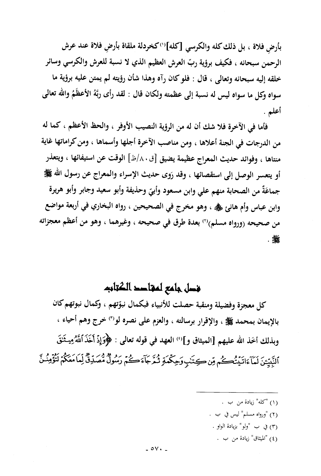 كل معجزة وفضيلة ومنقبة حصلت للأنبياء فبكمال نبوّتهم , وكمال نبوتهم كان بالإيمان بمحمد - صلى الله عليه وسلم - , والإقرار برسالته , والعزم على نصره لو (¬3) خرج وهم أحياء , وبذلك أخَذ الله عليهم [الميثاق و] (¬4) العهد في قوله تعالى: {وَإِذْ أَخَذَ اللَّهُ مِيثَاقَ النَّبِيِّينَ لَمَا آتَيْتُكُمْ مِنْ كِتَابٍ وَحِكْمَةٍ ثُمَّ جَاءَكُمْ رَسُولٌ مُصَدِّقٌ لِمَا مَعَكُمْ لَتُؤْمِنُنَّ