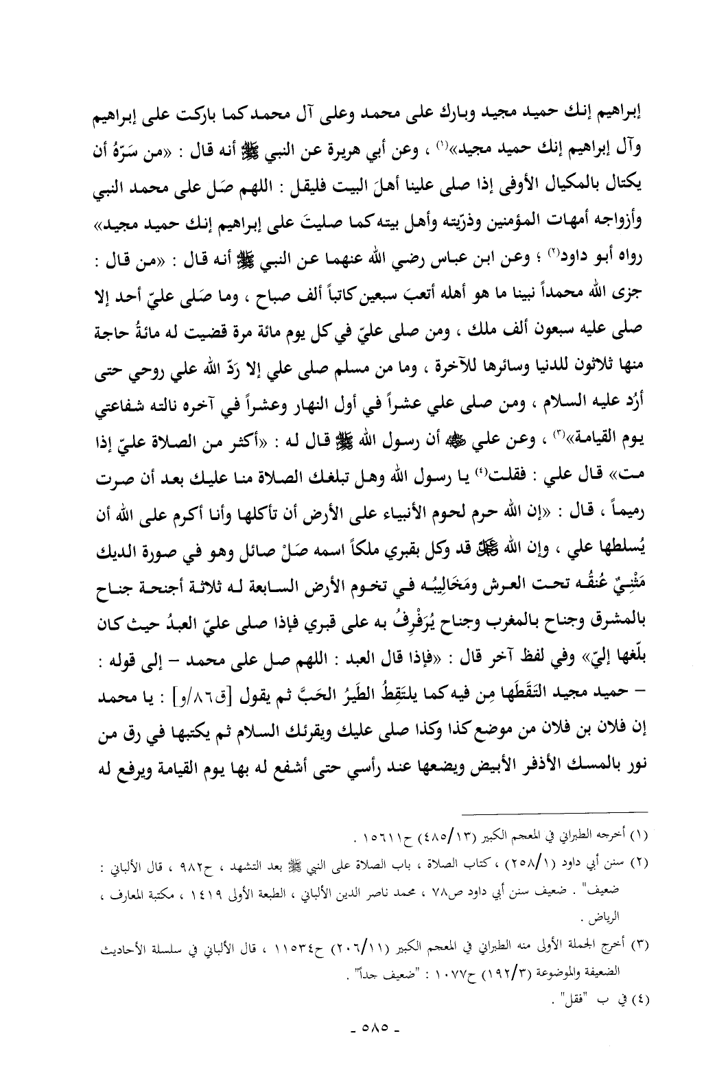 إبراهيم إنك حميد مجيد وبارك على محمد وعلى آل محمد كما باركت على إبراهيم وآل إبراهيم إنك حميد مجيد» (¬1) , وعن أبي هريرة عن النبي - صلى الله عليه وسلم - أنه قال: «من سَرّهُ أن يكتال بالمكيال الأوفى إذا صلى علينا أهلَ البيت فليقل: اللهم صَل على محمد النبي وأزواجه أمهات المؤمنين وذرّيته وأهل بيته كما صليتَ على إبراهيم إنك حميد مجيد» رواه أبو داود (¬2)؛ وعن ابن عباس رضي الله عنهما عن النبي - صلى الله عليه وسلم - أنه قال: «من قال: جزى الله محمداً نبينا ما هو أهله أتعبَ سبعين كاتباً ألف صباح , وما صَلى عليّ أحد إلا صلى عليه سبعون ألف ملك , ومن صلى عليّ في كل يوم مائة مرة قضيت له مائةُ حاجة منها ثلاثون للدنيا وسائرها للآخرة , وما من مسلم صلى علي إلا رَدّ الله علي روحي حتى أرُد عليه السلام , ومن صلى علي عشراً في أول النهار وعشراً في آخره نالته شفاعتي يوم القيامة» (¬3) , وعن علي - رضي الله عنه - أن رسول الله - صلى الله عليه وسلم - قال له: «أكثر من الصلاة عليّ إذا مت» قال علي: فقلت (¬4) يا رسول الله وهل تبلغك الصلاة منا عليك بعد أن صرت رميماً , قال: «إن الله حرم لحوم الأنبياء على الأرض أن تأكلها وأنا أكرم على الله أن يُسلطها علي , وإن الله - عز وجل - قد وكل بقبري ملكاً اسمه صَلْ صائل وهو في صورة الديك مَثْنِيٌ عُنقُه تحت العرش ومَخَالِيبُه في تخوم الأرض السابعة له ثلاثة أجنحة جناح بالمشرق وجناح بالمغرب وجناح يُرَفْرِفُ به على قبري فإذا صلى عليّ العبدُ حيث كان بلّغها إليّ» وفي لفظ آخر قال: «فإذا قال العبد: اللهم صل على محمد - إلى قوله: - حميد مجيد التَقَطَها مِن فيه كما يلتَقِطُ الطَيرُ الحَبَّ ثم يقول [ق 86/و]: يا محمد إن فلان بن فلان من موضع كذا وكذا صلى عليك ويقرئك السلام ثم يكتبها في رق من نور بالمسك الأذفر الأبيض ويضعها عند رأسي حتى أشفع له بها يوم القيامة ويرفع له