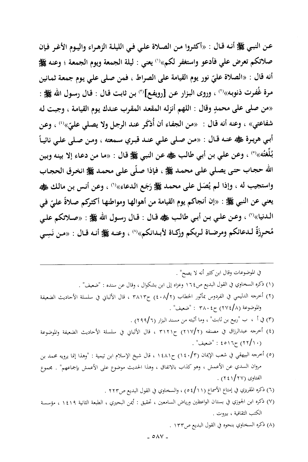 عن النبي - صلى الله عليه وسلم - أنه قال: «أكثروا من الصلاة علي في الليلة الزهراء واليوم الأغر فإن صلاتكم تعرض علي فأدعو واستغفر لكم» (¬1) يعني: ليلة الجمعة ويوم الجمعة؛ وعنه - صلى الله عليه وسلم - أنه قال: «الصلاة عليّ نور يوم القيامة على الصراط , فمن صلى علي يوم جمعة ثمانين مرة غُفرت ذنوبه» (¬2) , وروى البزار عن [رويفع] (¬3) بن ثابت قال: قال رسول الله - صلى الله عليه وسلم -: «من صلى على محمدٍ وقال: اللهم أنزله المقعد المقرب عندك يوم القيامة , وجبت له شفاعتي» , وعنه أنه قال: «من الجفاء أن أُذكَر عند الرجل ولا يصلي عليّ» (¬4) , وعن أبي هريرة - رضي الله عنه - عنه قال: «من صلى علي عند قبري سمعته , ومن