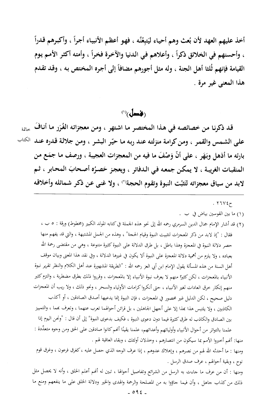 (¬2) قد أشار الإمام جمال الدين السرمري رحمه الله إلى نحو هذه الجملة في كتابه المولد الكبير (مخطوط) ورقة: 5 ب , فقال: "إذ لابد من ذكر المعجزات لتثبيت النبوة وقيام الحجة" , وهذه من الجمل المشتبهة , والتي قد يفهم منها حصر دلالة النبوة في المعجزة وهذا باطل , بل طرق الدلالة على النبوة كثيرة متنوعة، وهي من مقتضى رحمة الله بعباده , ولا يلزم من أهمية دلالة المعجزة على النبوة ألا يكون في غيرها الدلالة , وفي نقد هذا المعنى وبيان موقف أهل السنة من هذه المسألة يقول الإمام ابن أبي العز رحمه الله: "الطريقة المشهورة عند أهل الكلام والنظر تقرير نبوة الأنبياء بالمعجزات، لكن كثيرًا منهم لا يعرف نبوة الأنبياء إلا بالمعجزات، وقرروا ذلك بطرق مضطربة , والتزم كثير منهم إنكار خرق العادات لغير الأنبياء , حتى أنكروا كرامات الأولياء والسحر , ونحو ذلك , ولا ريب أن المعجزات دليل صحيح، لكن الدليل غير محصور في المعجزات، فإن النبوة إنما يدعيها أصدق الصادقين، أو أكذب الكاذبين، ولا يلتبس هذا بهذا إلا على أجهل الجاهلين، بل قرائن أحوالهما تعرب عنهما، وتعرف بهما، والتمييز بين الصادق والكاذب له طرق كثيرة فيما دون دعوى النبوة، فكيف بدعوى النبوة" إلى أن قال: "ونحن اليوم إذا علمنا بالتواتر من أحوال الأنبياء وأوليائهم وأعدائهم، علمنا يقينًا أنهم كانوا صادقين على الحق ومن وجوه متعدِّدة: