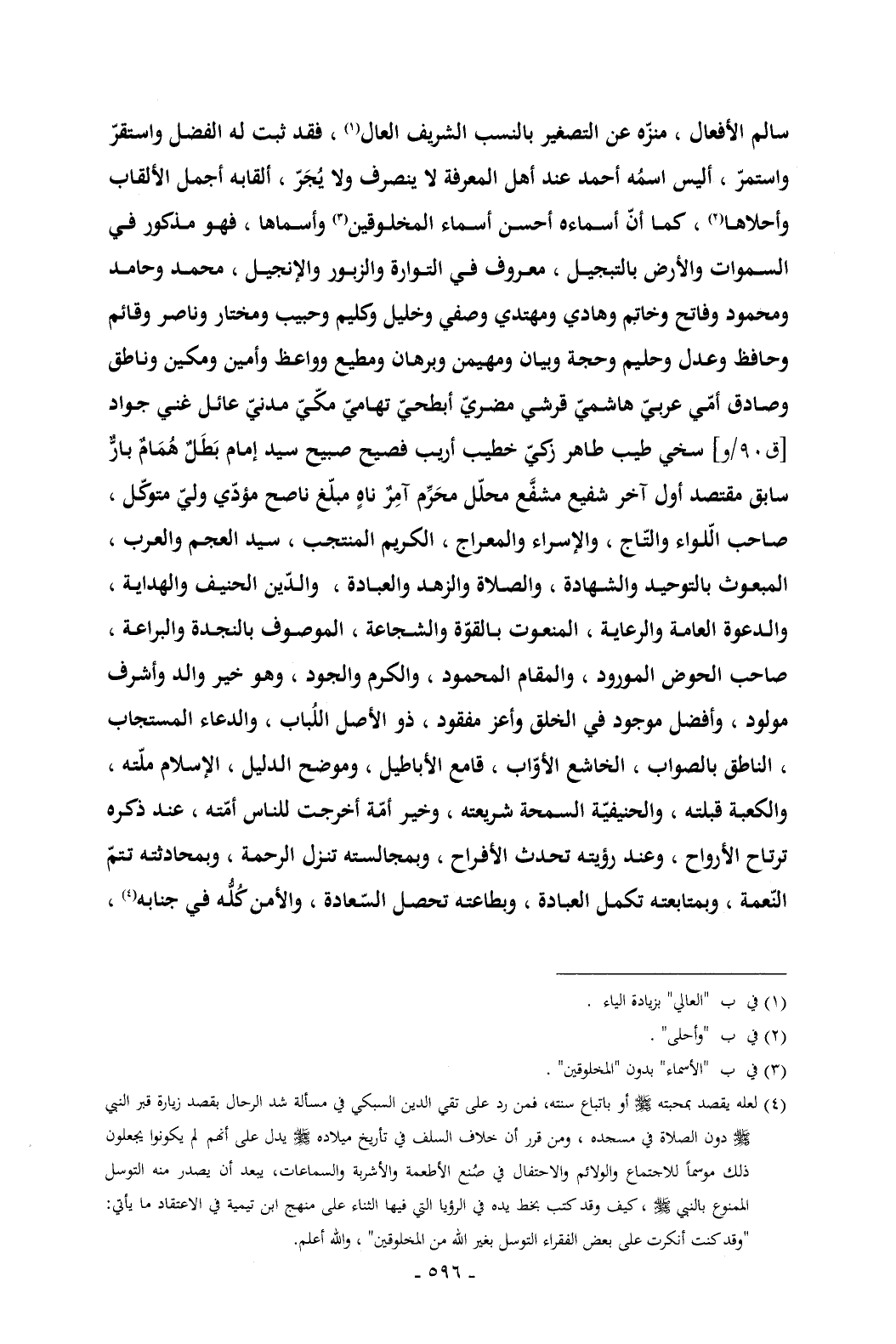 (¬4) لعله يقصد بمحبته - صلى الله عليه وسلم - أو باتباع سنته, فمن رد على تقي الدين السبكي في مسألة شد الرحال بقصد زيارة قبر النبي - صلى الله عليه وسلم - دون الصلاة في مسجده , ومن قرر أن خلاف السلف في تأريخ ميلاده - صلى الله عليه وسلم - يدل على أنهم لم يكونوا يجعلون ذلك موسماً للاجتماع والولائم والاحتفال في صُنع الأطعمة والأشربة والسماعات, يبعد أن يصدر منه التوسل الممنوع بالنبي - صلى الله عليه وسلم - , كيف وقد كتب بخط يده في الرؤيا التي فيها الثناء على منهج ابن تيمية في الاعتقاد ما يأتي: "وقد كنت أنكرت على بعض الفقراء التوسل بغير الله من المخلوقين" , والله أعلم.