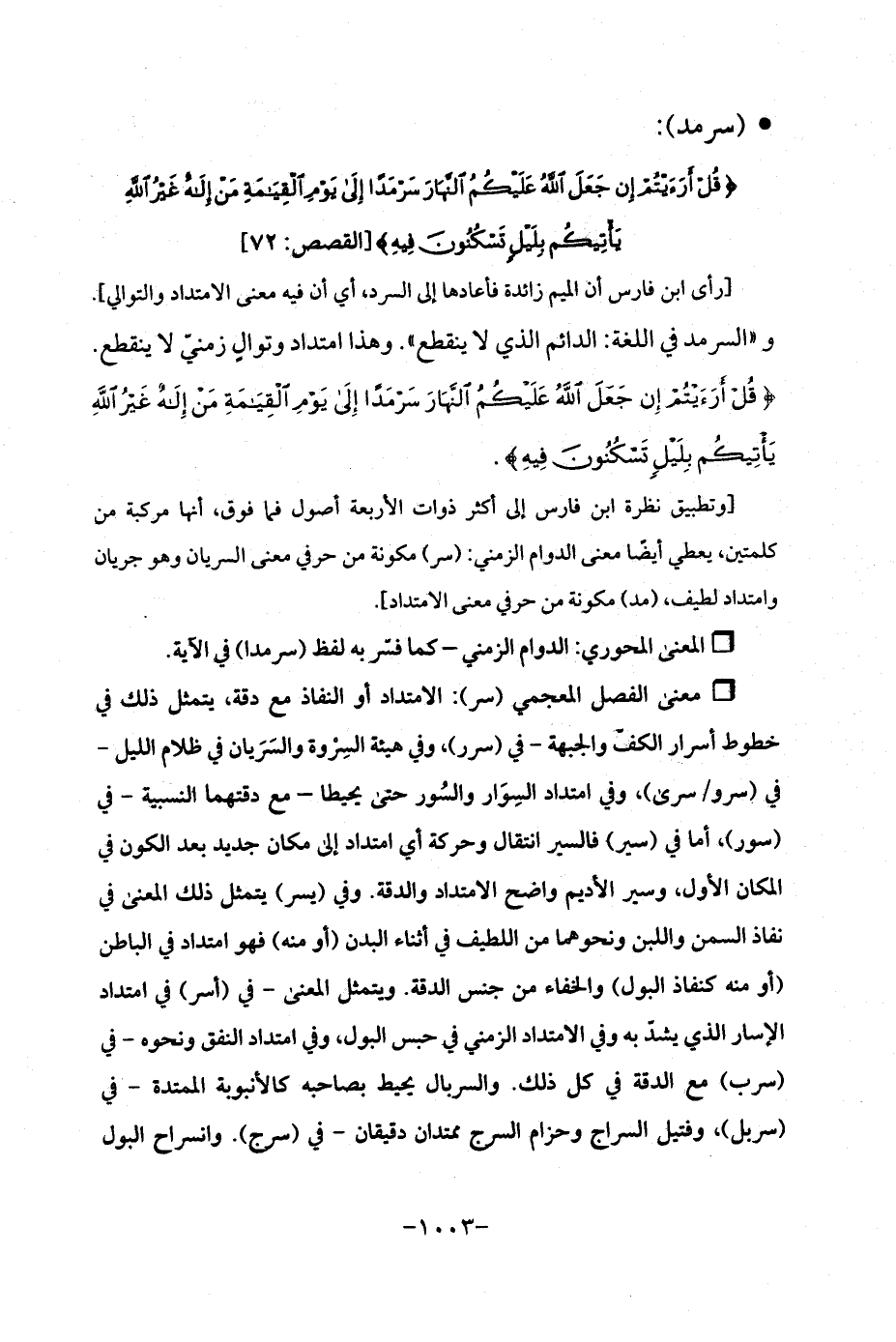 [وتطبيق نظرة ابن فارس إلى أكثر ذوات الأربعة أصول فما فوق، أنها مركبة من كلمتين، يعطي أيضًا معنى الدوام الزمني: (سر) مكونة من حرفي معنى السريان وهو جريان وامتداد لطيف، (مد) مكونة من حرفي معنى الامتداد].
