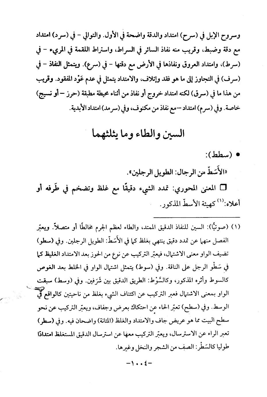 (¬1) (صوتيًّا): السين للنفاذ الدقيق الممتد، والطاء لعظم الجرم مخالطًا أو متصلًا. ويعبّر الفصل منهما عن تمدد دقيق ينتهي بغلظ كما في الأَسَطّ: الطويل الرجلين. وفي (سطو) تضيف الواو معنى الاشتمال، فيعبّر التركيب عن نوع من الحوز بعد الامتداد الغليظ كما في سَطْو الرجل على الناقة. وفي (سوط) يتمثل اشتمال الواو في الخلط بعد الغوص كالسوط وأثره المذكور، وكالسَّوْط: الطريق الدقيق بين شَرَفين. وفي (وسط) سبقت الواو بمعنى الاشتمال فعبر التركيب عن اكتناف الشيء بغلظ من ناحيتين كالواقع في الوسط. وفي (سطح) تعبّر الحاء عن احتكاك بعرض وجفاف، ويعبّر التركيب عن نحو سطح البيت مما هو عريض جاف والامتداد والغلظ (المتانة) واضحان فيه. وفي (سطر) تعبر الراء عن الاسترسال، ويعبّر التركيب معها عن استرسال الدقيق المستغلظ امتدادًا طوليا كالسَطْر: الصف من الشجر والنخل وغيرها.