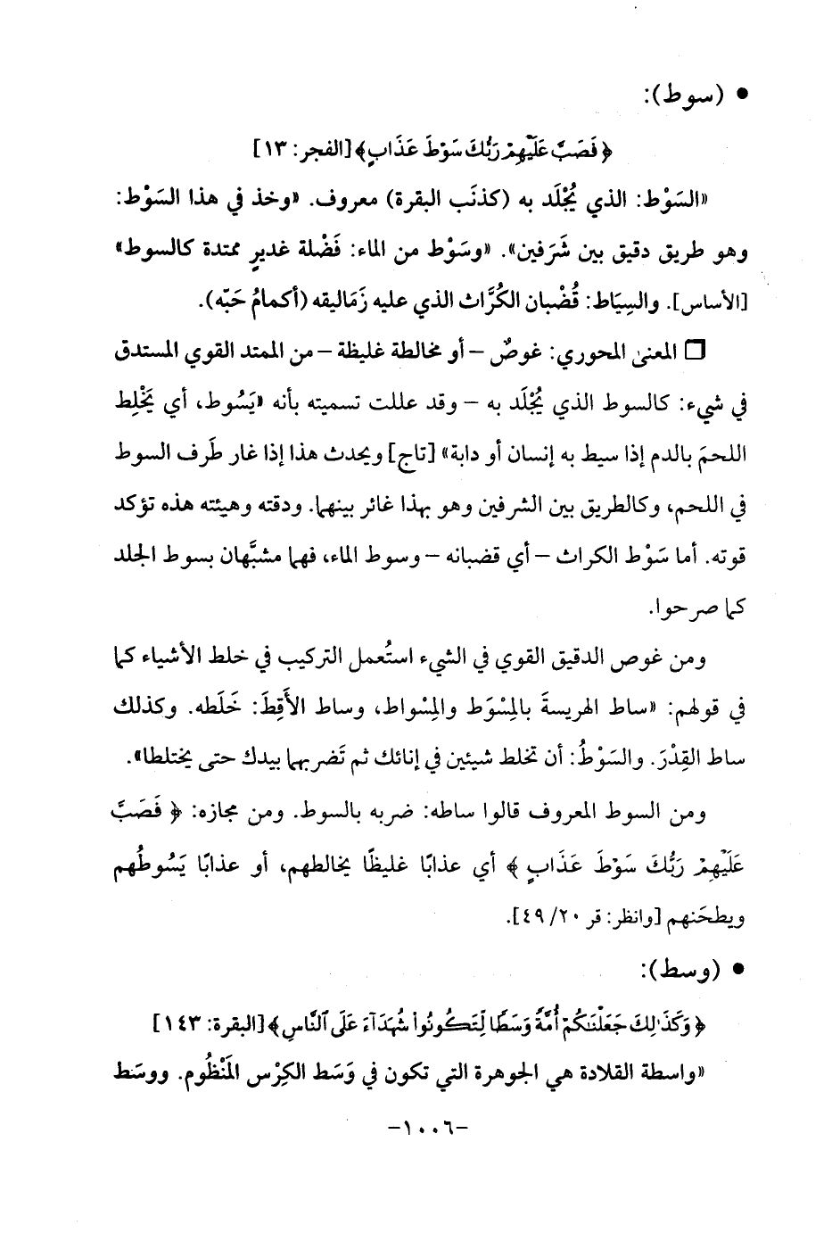 ومن السوط المعروف قالوا ساطه: ضربه بالسوط. ومن مجازه: {فَصَبَّ عَلَيْهِمْ رَبُّكَ سَوْطَ عَذَابٍ} أي عذابًا غليظًا يخالطهم، أو عذابًا يَسُوطُهم ويطحَنهم [وانظر: قر 20/ 49].