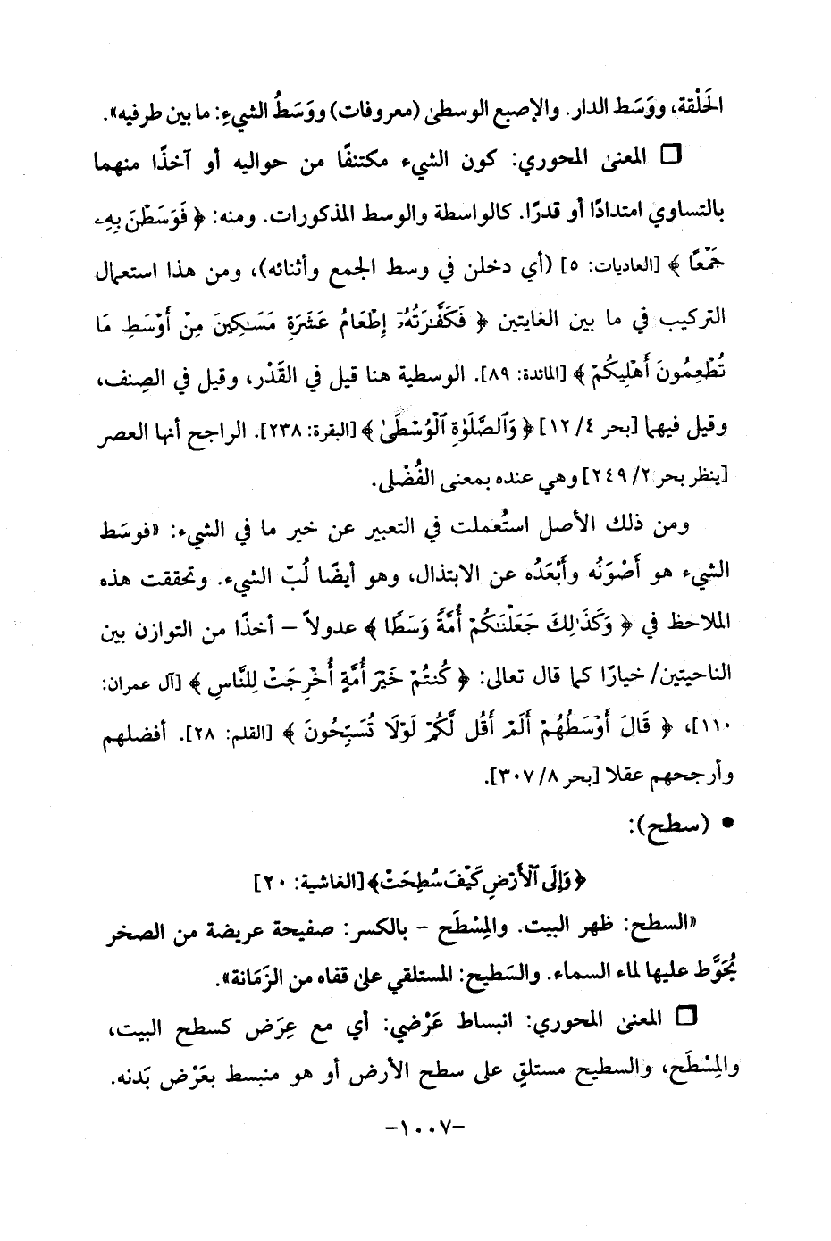 Qكون الشيء مكتنفًا من حواليه أو آخذًا منهما بالتساوي امتدادًا أو قدرًا. كالواسطة والوسط المذكورات. ومنه: {فَوَسَطْنَ بِهِ جَمْعًا} [العاديات: 5] (أي دخلن في وسط الجمع وأثنائه)، ومن هذا استعمال التركيب في ما بين الغايتين {فَكَفَّارَتُهُ إِطْعَامُ عَشَرَةِ مَسَاكِينَ مِنْ أَوْسَطِ مَا تُطْعِمُونَ أَهْلِيكُمْ} [المائدة: 89]. الوسطية هنا قيل في القَدْر، وقيل في الصِنف، وقيل فيهما [بحر 4/ 12] {وَالصَّلَاةِ الْوُسْطَى} [البقرة: 238]. الراجح أنها العصر [ينظر بحر 2/ 249] وهي عنده بمعنى الفُضْلى.