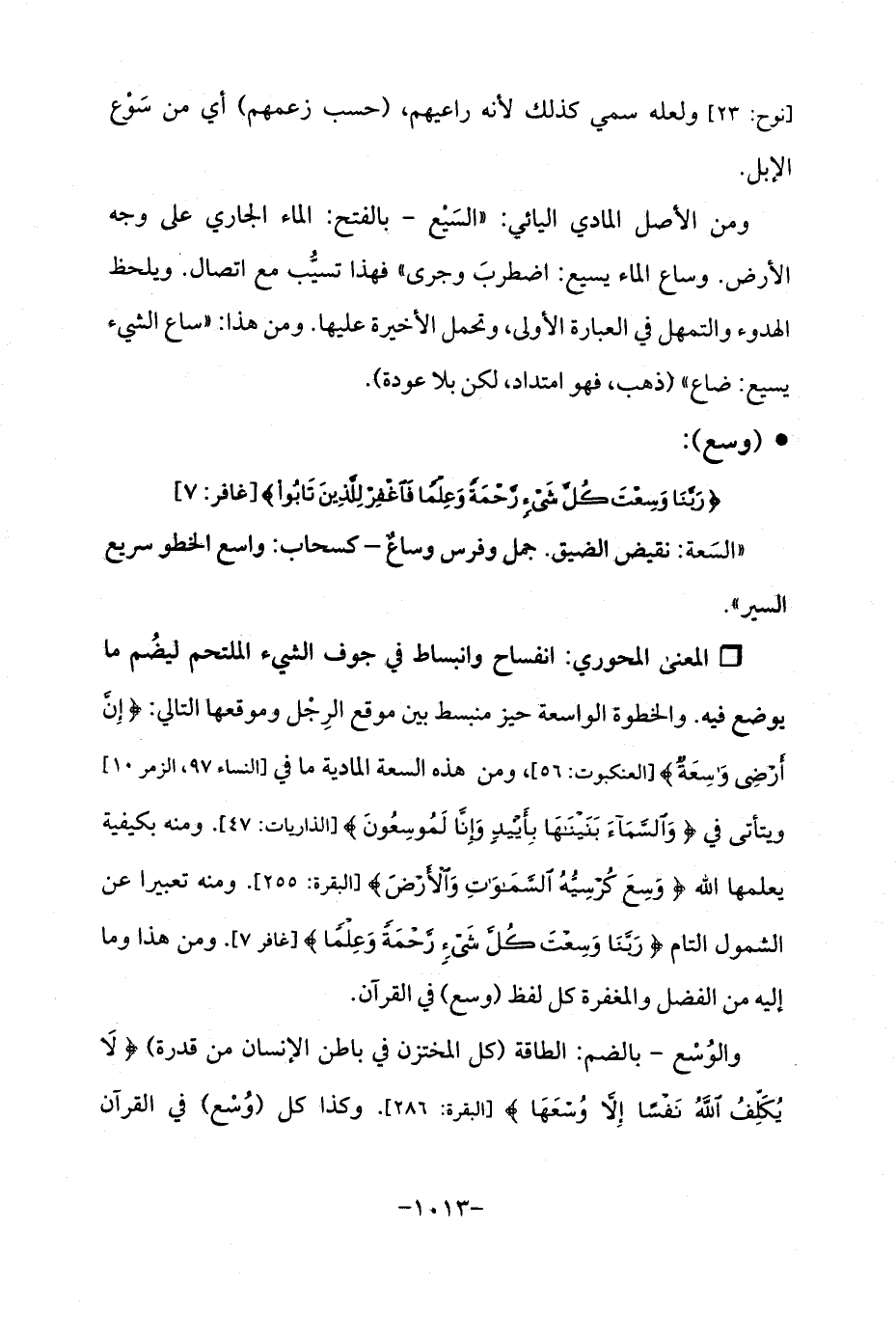 Qانفساح وانبساط في جوف الشيء الملتحم ليضُم ما يوضع فيه. والخطوة الواسعة حيز منبسط بين موقع الرِجْل وموقعها التالي: {إِنَّ أَرْضِي وَاسِعَةٌ} [العنكبوت: 56]، ومن هذه السعة المادية ما في [النساء 97، الزمر 10] ويتأتى في {وَالسَّمَاءَ بَنَيْنَاهَا بِأَيْدٍ وَإِنَّا لَمُوسِعُونَ} [الذاريات: 47]. ومنه بكيفية يعلمها الله {وَسِعَ كُرْسِيُّهُ السَّمَاوَاتِ وَالْأَرْضَ} [البقرة: 255]. ومنه تعبيرا عن الشمول التام {رَبَّنَا وَسِعْتَ كُلَّ شَيْءٍ رَحْمَةً وَعِلْمًا} [غافر: 7]. ومن هذا وما إليه من الفضل والمغفرة كل لفظ (وسع) في القرآن.