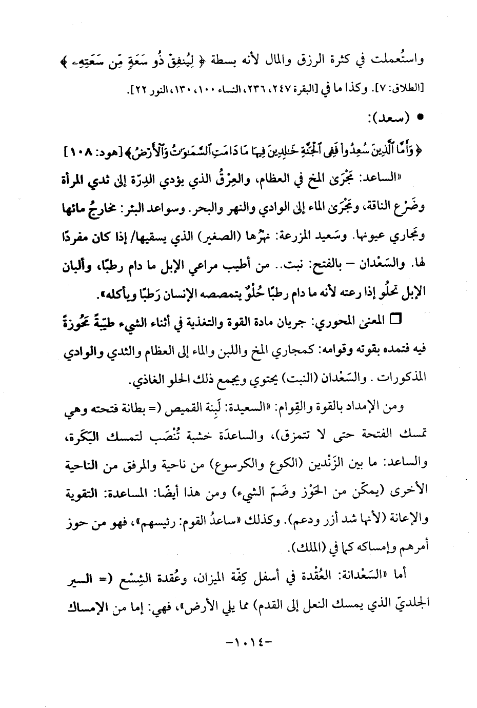 "الساعد: مَجْرَى المخ في العظام، والعِرْقُ الذي يؤدي الدِرّة إلى ثدي المرأة وضَرْع الناقة، ومَجْرَى الماء إلى الوادي والنهر والبحر. وسواعد البئر: مخارجُ مائها ومَجاري عيونها. وسَعيد المزرعة: نهْرُها (الصغير) الذي يسقيها/ إذا كان مفردًا لها. والسَعْدان - بالفتح: نبت .. من أطيب مراعي الإبل ما دام رطبًا، وألبان الإبل تحلُو إذا رعته لأنه ما دام رطبًا حُلْوٌ يتمصصه الإنسان رَطبًا ويأكله ".